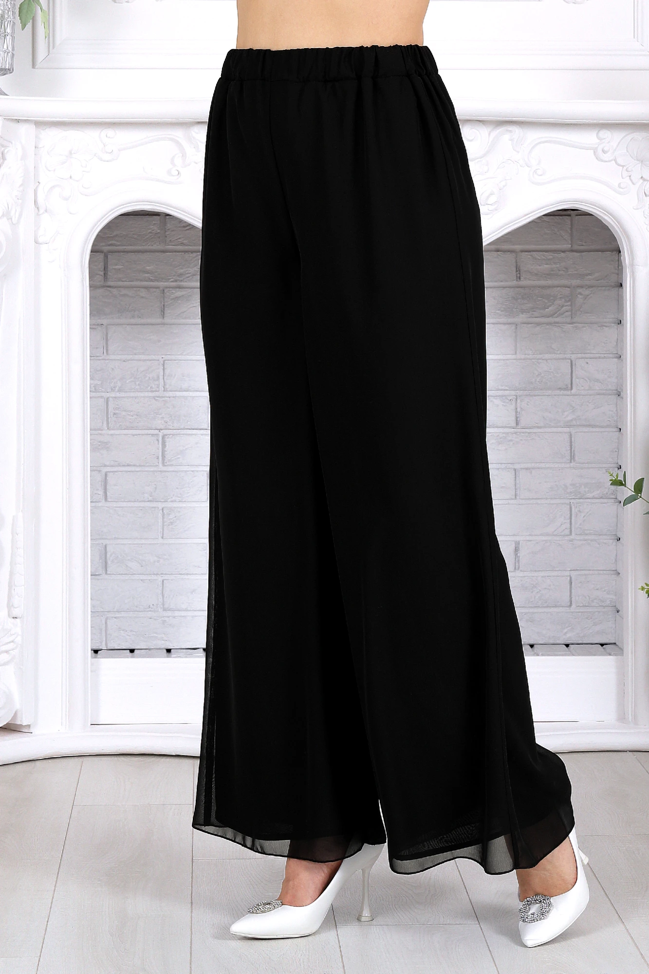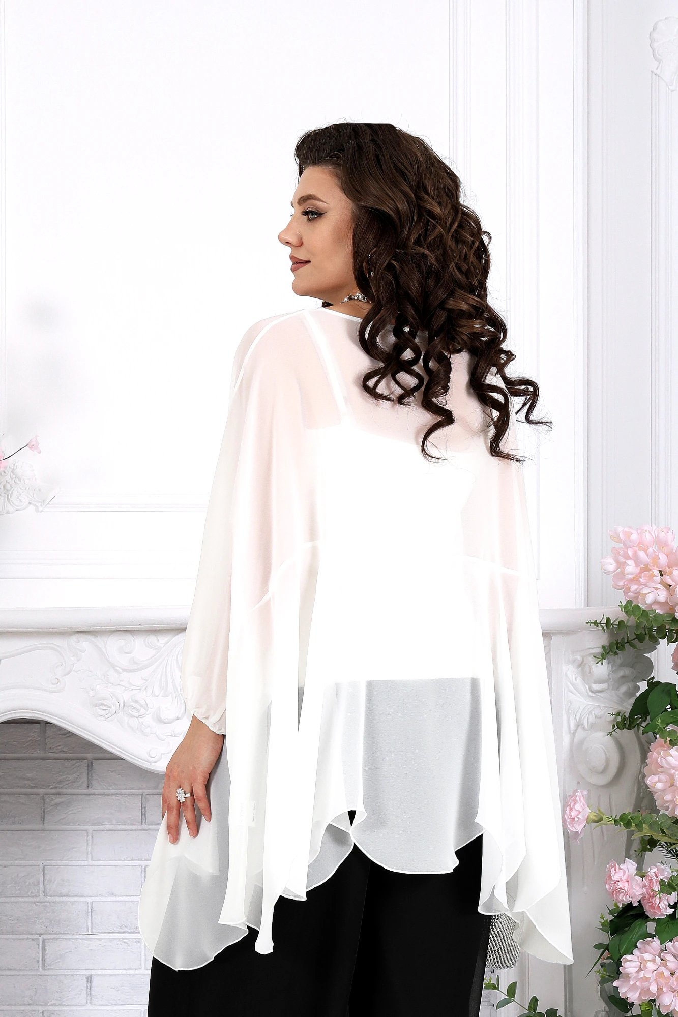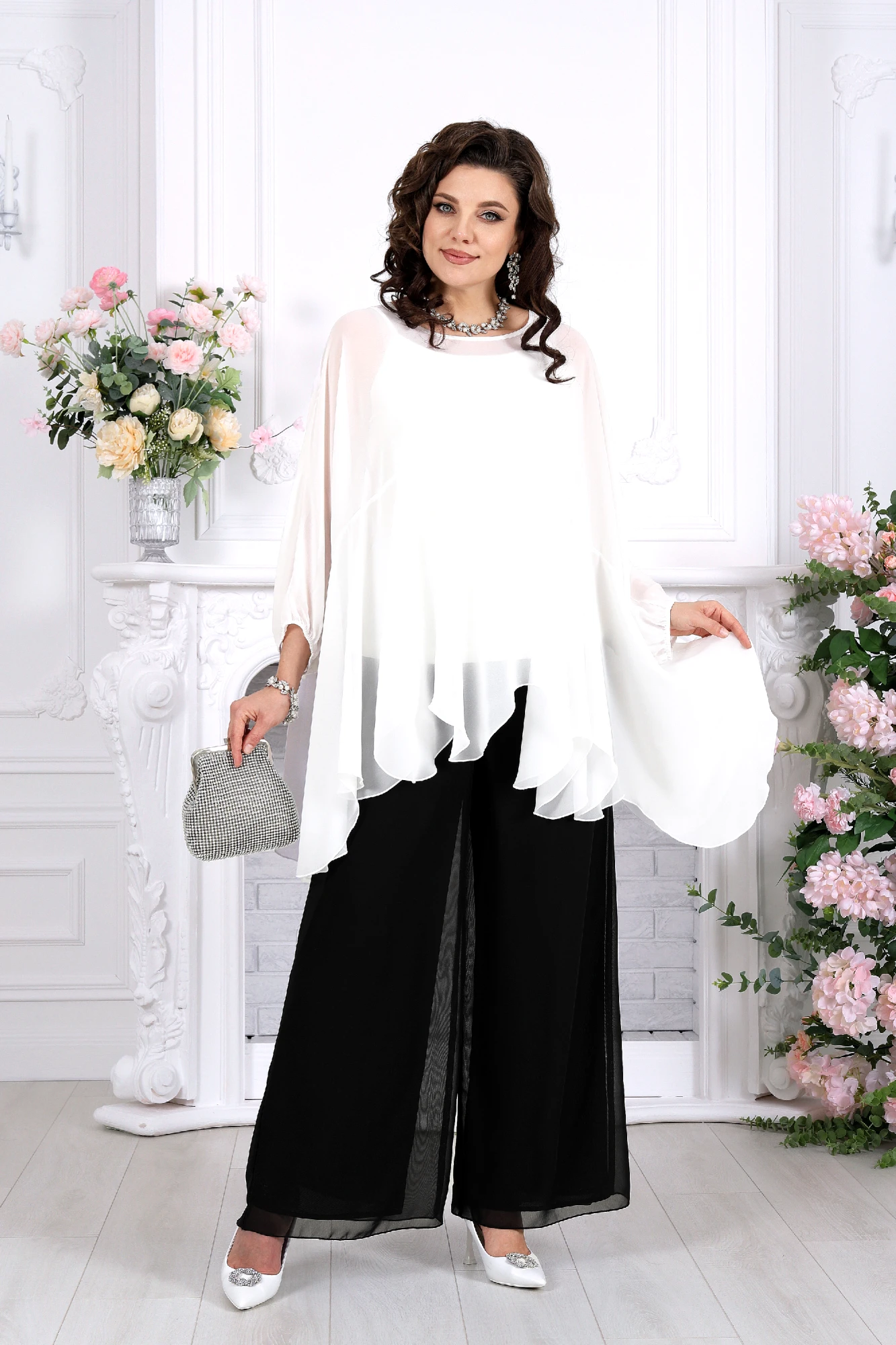 Брючный костюм 3 в 1 — легкость, которая преображает. Этот костюм — про особую эстетику: мягкие линии, воздушные ткани и ощущение свободы в каждом движении. Он создан для женщин, которые ценят комфорт, но не готовы отказываться от эффектного внешнего вида. Полупрозрачная туника словно окутывает силуэт легкой вуалью, добавляя образу загадочности и утонченности. Внутренний топ формирует аккуратную основу, а струящиеся брюки завершают ансамбль, создавая вытянутый, элегантный силуэт. Это тот случай, когда наряд выглядит дорого и сложносочинённо, но ощущается легко и непринужденно. Легкие, воздушные материалы делают комплект идеальным для весенне-летнего сезона. Он не утяжеляет образ, красиво движется при ходьбе и дарит ощущение свободы и уверенности. Комплект брючный 3-х предметный, состоящий из туники, блузки и брюк. Туника оверсайз свободного силуэта, отрезная по линии груди. Рукав цельнокроеный, по низу собран на узкую резинку. Круглый вырез горловины переда и спинки окантован. Низ туники фигурный, обработан швом «флэш». Длина туники –75,0 см (50-58 р-р); длина цельнокроенного рукава с учетом плечевого шва – 57,5 см (50-52 р-р), 59,0 см (54-58 р-р). Блузка-топ прилегающего силуэта, выполнена из вискозного трикотажного полотна. Модель без застежки, без рукавов, на регулируемых по длине узких бретелях. Верхний край переда окантован. Для лучшего прилегания изделия, в подгибку верхнего края спинки протянута эластичная лента. Длина топа (по спинке) – 38,0 см (50-58 р-р). Брюки широкие выполнены из ткани шифон на трикотажной подкладке по всей длине. Модель без стрелок и без застежки. Спереди обработаны наклонные боковые карманы. Для лучшего прилегания по линии талии в притачном поясе предусмотрена эластичная лента, вставленная по всей длине пояса. Длина брюк по боковому (с поясом) -107 см (50-52 р-р), 108 см (54-58 р-р).