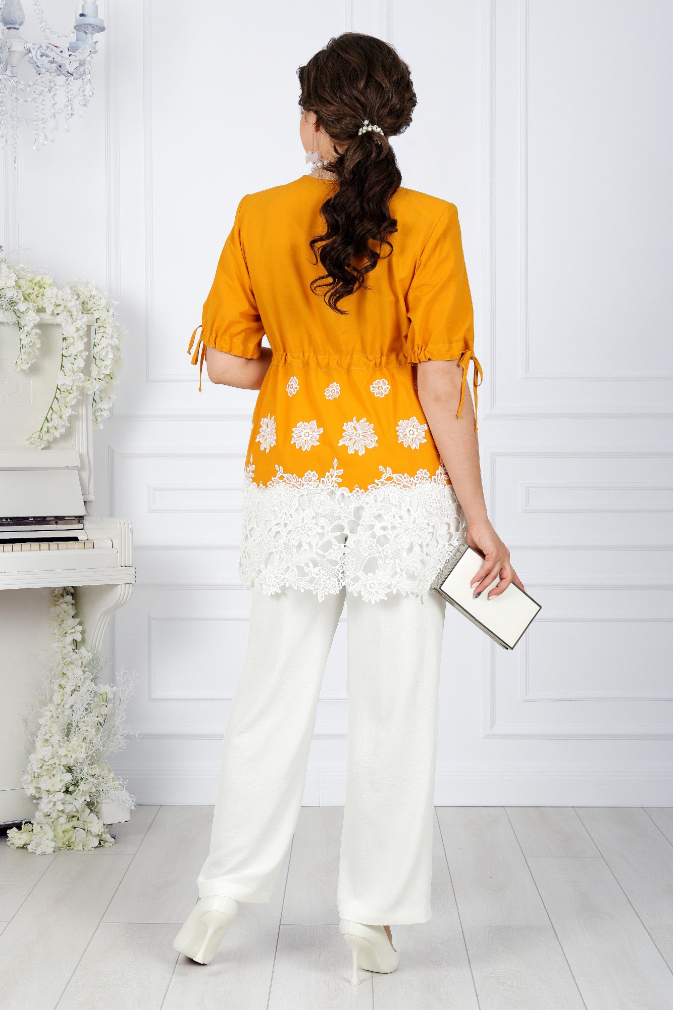 Блузка полуприлегающего силуэта, отрезная выше линии талии с кулисой, нижняя часть блузки оформлена декоративным кружевом. Длина изделия по среднему шву спинки 81 см. Перед с вытачками, идущими от пройм до низа. На переде, по центру кулисы, обработаны 2 петли, через которые протянут шнур для регулировки сборки по талии. По центру переда от горловины вниз обработан разрез U- образной формы в который вставлены 2 декоративные детали, переплетающиеся между собой в виде петель. Горловина спинки округлой формы, по переду округлая, углубленная. Рукава втачные, одношовные, по низу обработанные кулисой. По низу рукавов, по центру кулисы, обработаны по 2 петли, через которые протянут шнур для регулировки сборки по рукаву. Блузка с плечевыми накладками. Брюки с посадкой на талии, с учетом пояса, зауженные к низу, на притачном поясе с резинкой вдоль всего пояса.