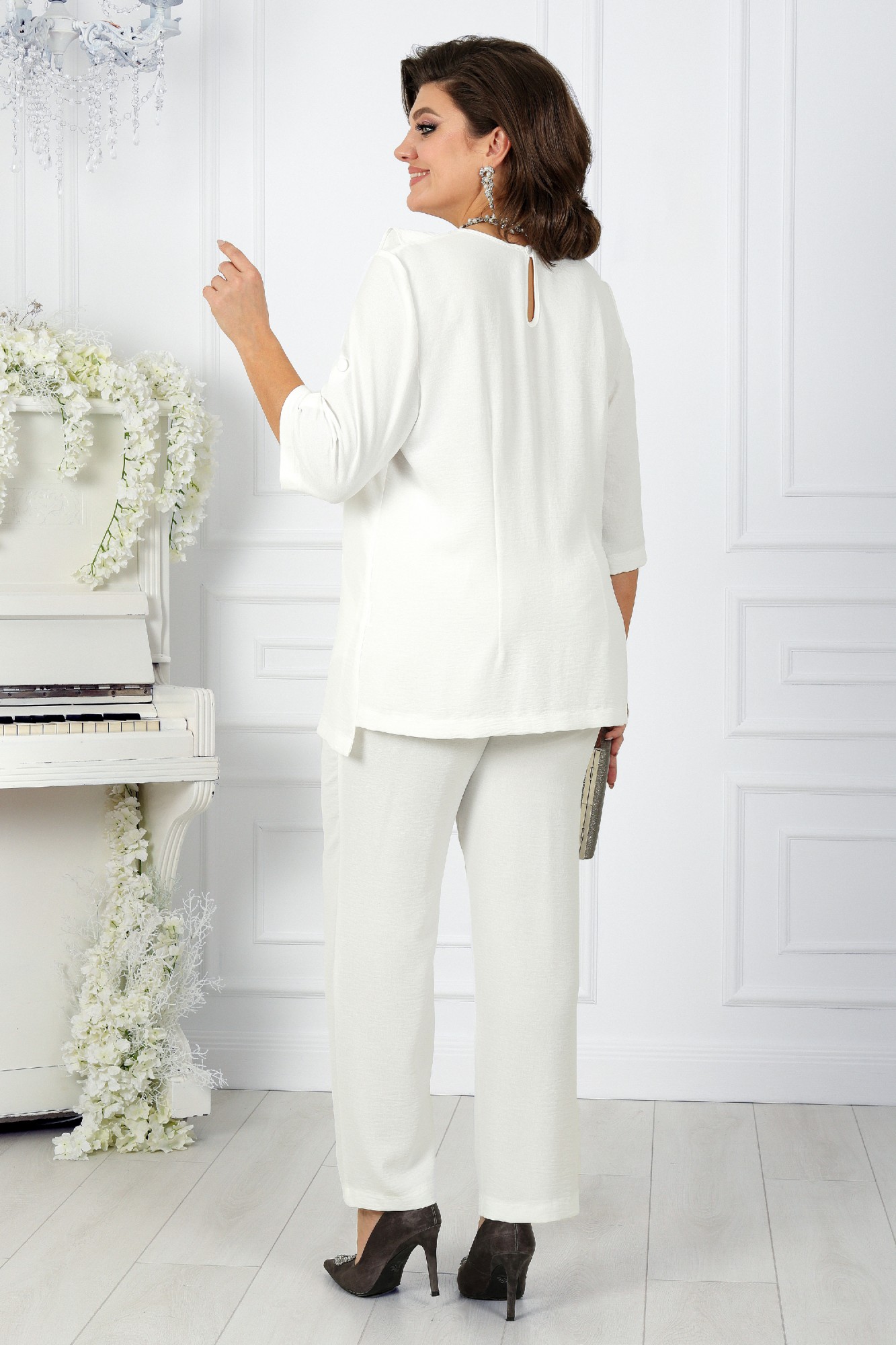Этот женский костюм — идеальный выбор для летних дней, выполнен из легкой однотонной ткани, обеспечивая комфорт и стиль. Сочетание легкой ткани, изящного дизайна блузки с воланом и классических брюк делает этот костюм универсальным решением для различных событий. Он подходит как для офисного дня, добавляя деловой шик вашему образу, так и для торжественного мероприятия, придавая вам элегантности и утонченности. Комплект брючный 2-х предметный, состоящий из блузки и брюк, выполненных из ткани креп. Блузка полуприлегающего силуэта, длиной по середине спинки 67 см. Перед с нагрудными вытачками, выходящими из пройм, с фигурным подрезом с притачным воланом, идущим из левого плеча, и уходящим в низ, в правый боковой шов. Срез волана обработан узким "московским" швом. Перед с ассиметричным низом: левая боковая часть переда длиннее спинки по левому боковому шву на 5 см. Левая и правая части переда по низу образуют А-образный разрез. Спинка с талиевыми вытачками, с фигурным разрезом "капля", идущим от горловины вниз, застегивающийся на 1 навесную петлю и 1 пуговицу. Горловина спинки округлой формы, по переду округлая, углубленная. Срезы горловин переда, спинки и разреза "капля", окантованные. Рукава втачные, одношовные, с настрочными патами, застегивающимися на 1 петлю и 1 пуговицу . Рукав по длине может регулироваться с помощью паты. Блузка с плечевыми накладками. Брюки классические, с посадкой на талии, на притачном поясе, с застёжкой на тесьму-«молния», расположенную в среднем шве передних половинок, 1 петлю и 1 пуговицу на поясе. Передние и задние половинки брюк с талиевыми вытачками, идущими от пояса вниз, с боковыми наклонными карманами на передних половинках. Для лучшего прилегания брюк в области талии в поясе со стороны спинки вставлена резинка.