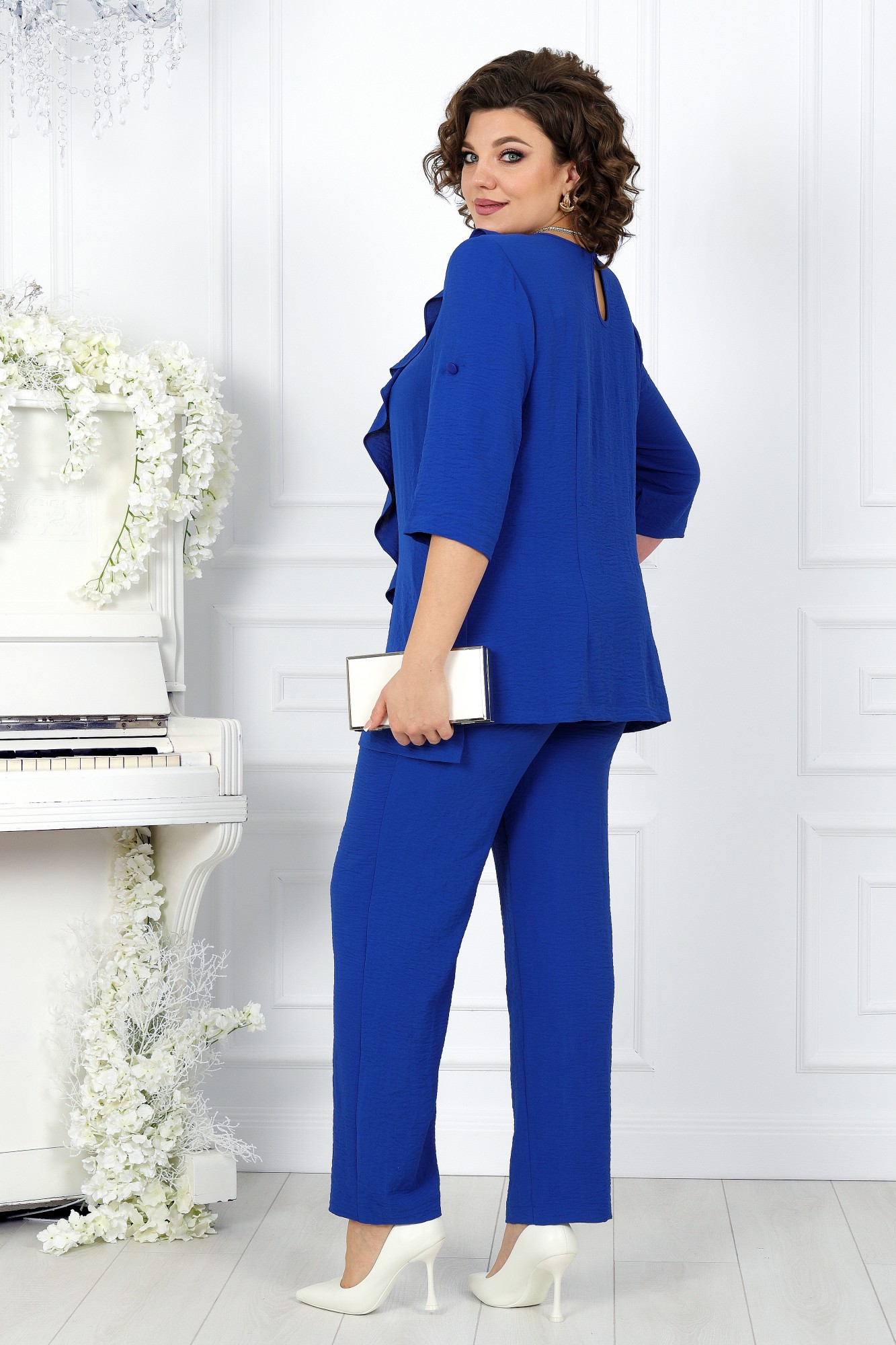 Этот женский костюм — идеальный выбор для летних дней, выполнен из легкой однотонной ткани, обеспечивая комфорт и стиль. Сочетание легкой ткани, изящного дизайна блузки с воланом и классических брюк делает этот костюм универсальным решением для различных событий. Он подходит как для офисного дня, добавляя деловой шик вашему образу, так и для торжественного мероприятия, придавая вам элегантности и утонченности. Комплект брючный 2-х предметный, состоящий из блузки и брюк, выполненных из ткани креп. Блузка полуприлегающего силуэта, длиной по середине спинки 67 см. Перед с нагрудными вытачками, выходящими из пройм, с фигурным подрезом с притачным воланом, идущим из левого плеча, и уходящим в низ, в правый боковой шов. Срез волана обработан узким "московским" швом. Перед с ассиметричным низом: левая боковая часть переда длиннее спинки по левому боковому шву на 5 см. Левая и правая части переда по низу образуют А-образный разрез. Спинка с талиевыми вытачками, с фигурным разрезом "капля", идущим от горловины вниз, застегивающийся на 1 навесную петлю и 1 пуговицу. Горловина спинки округлой формы, по переду округлая, углубленная. Срезы горловин переда, спинки и разреза "капля", окантованные. Рукава втачные, одношовные, с настрочными патами, застегивающимися на 1 петлю и 1 пуговицу . Рукав по длине может регулироваться с помощью паты. Блузка с плечевыми накладками. Брюки классические, с посадкой на талии, на притачном поясе, с застёжкой на тесьму-«молния», расположенную в среднем шве передних половинок, 1 петлю и 1 пуговицу на поясе. Передние и задние половинки брюк с талиевыми вытачками, идущими от пояса вниз, с боковыми наклонными карманами на передних половинках. Для лучшего прилегания брюк в области талии в поясе со стороны спинки вставлена резинка.