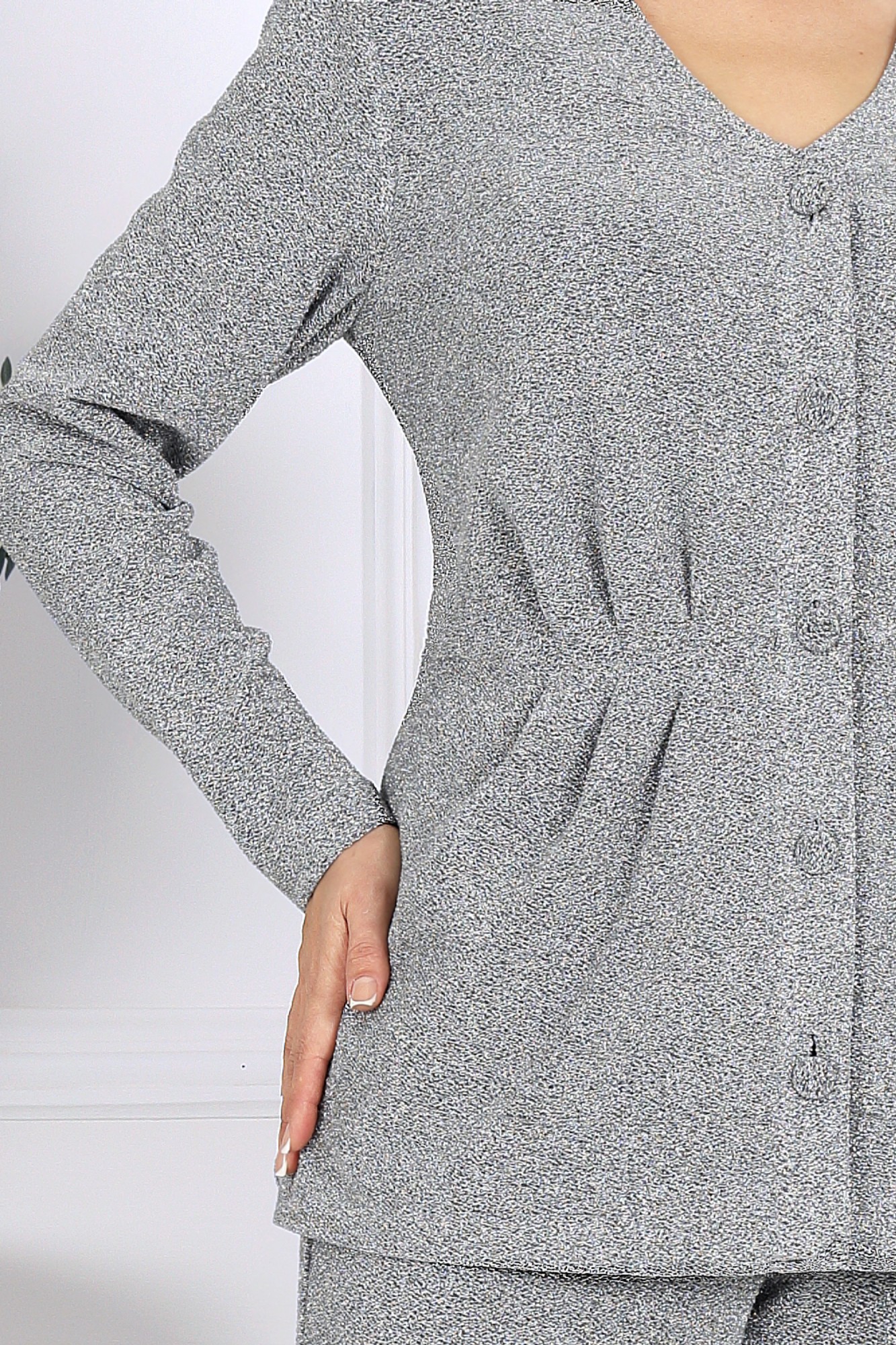 Элегантный брючный комплект – идеальный выбор для праздника, вечера в ресторане или важного мероприятия. Жакет с выразительным V-образным вырезом и аккуратными складками по линии талии подчёркивает женственный силуэт, а сияющая ткань с люрексом придаёт образу динамику и мягкость, создавая гармоничное сочетание классики и современности. Комплект брючный 2-х предметный, состоящий из жакета и брюк. Жакет отрезной по линии талии, выполнен из трикотажного полотна с фактурной лицевой стороной «люрекс». Модель на подкладке, с плечевыми накладками; без воротника, с V-образным вырезом горловины. В верхней части переда заложены 3 односторонние складки, направленные от талии к центру груди, и 3 односторонние складки на баске, направленные к низу. На спинке обработаны талиевые вытачки. Борта и горловина оформлены отрезной планкой. Жакет с однобортной застежкой на 5 прорезных петель и 5 пуговиц, обтянутые основным материалом. Рукав длинный, втачной. Длина жакета – 68 см; длина рукава – 61 см. Брюки классические длинные, прямого силуэта, с посадкой на талии, выполнены из трикотажного полотна с фактурной лицевой стороной «люрекс». Модель без застёжки, на притачном поясе, с эластичной лентой внутри. Передние половинки брюк с боковыми наклонными карманами. Длина брюк по боковому (с поясом) – 108 см.