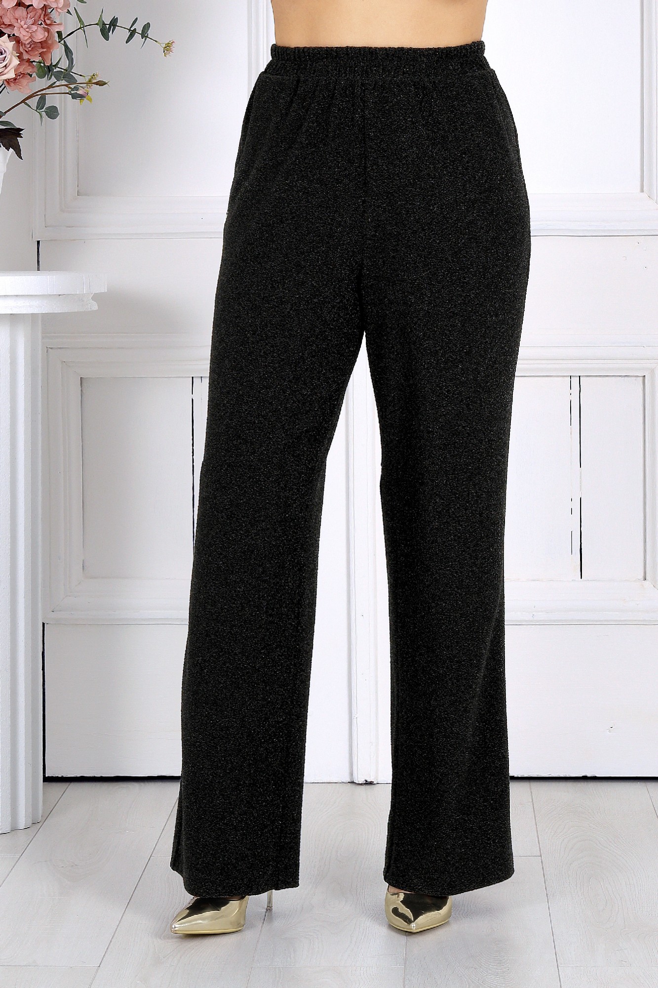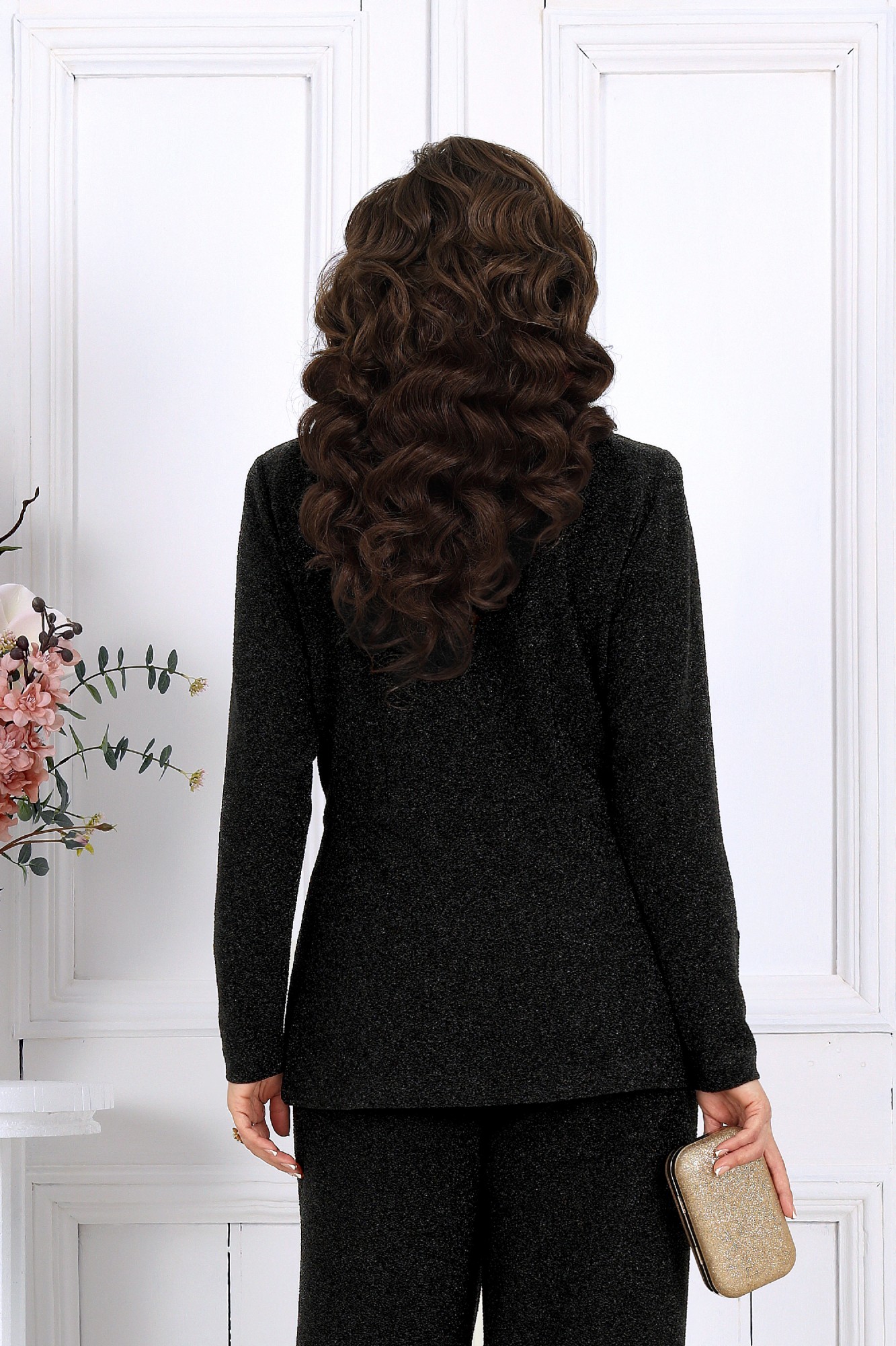 Элегантный брючный комплект – идеальный выбор для праздника, вечера в ресторане или важного мероприятия. Жакет с выразительным V-образным вырезом и аккуратными складками по линии талии подчёркивает женственный силуэт, а сияющая ткань с люрексом придаёт образу динамику и мягкость, создавая гармоничное сочетание классики и современности. Комплект брючный 2-х предметный, состоящий из жакета и брюк. Жакет отрезной по линии талии, выполнен из трикотажного полотна с фактурной лицевой стороной «люрекс». Модель на подкладке, с плечевыми накладками; без воротника, с V-образным вырезом горловины. В верхней части переда заложены 3 односторонние складки, направленные от талии к центру груди, и 3 односторонние складки на баске, направленные к низу. На спинке обработаны талиевые вытачки. Борта и горловина оформлены отрезной планкой. Жакет с однобортной застежкой на 5 прорезных петель и 5 пуговиц, обтянутые основным материалом. Рукав длинный, втачной. Длина жакета – 68 см; длина рукава – 61 см. Брюки классические длинные, прямого силуэта, с посадкой на талии, выполнены из трикотажного полотна с фактурной лицевой стороной «люрекс». Модель без застёжки, на притачном поясе, с эластичной лентой внутри. Передние половинки брюк с боковыми наклонными карманами. Длина брюк по боковому (с поясом) – 108 см.