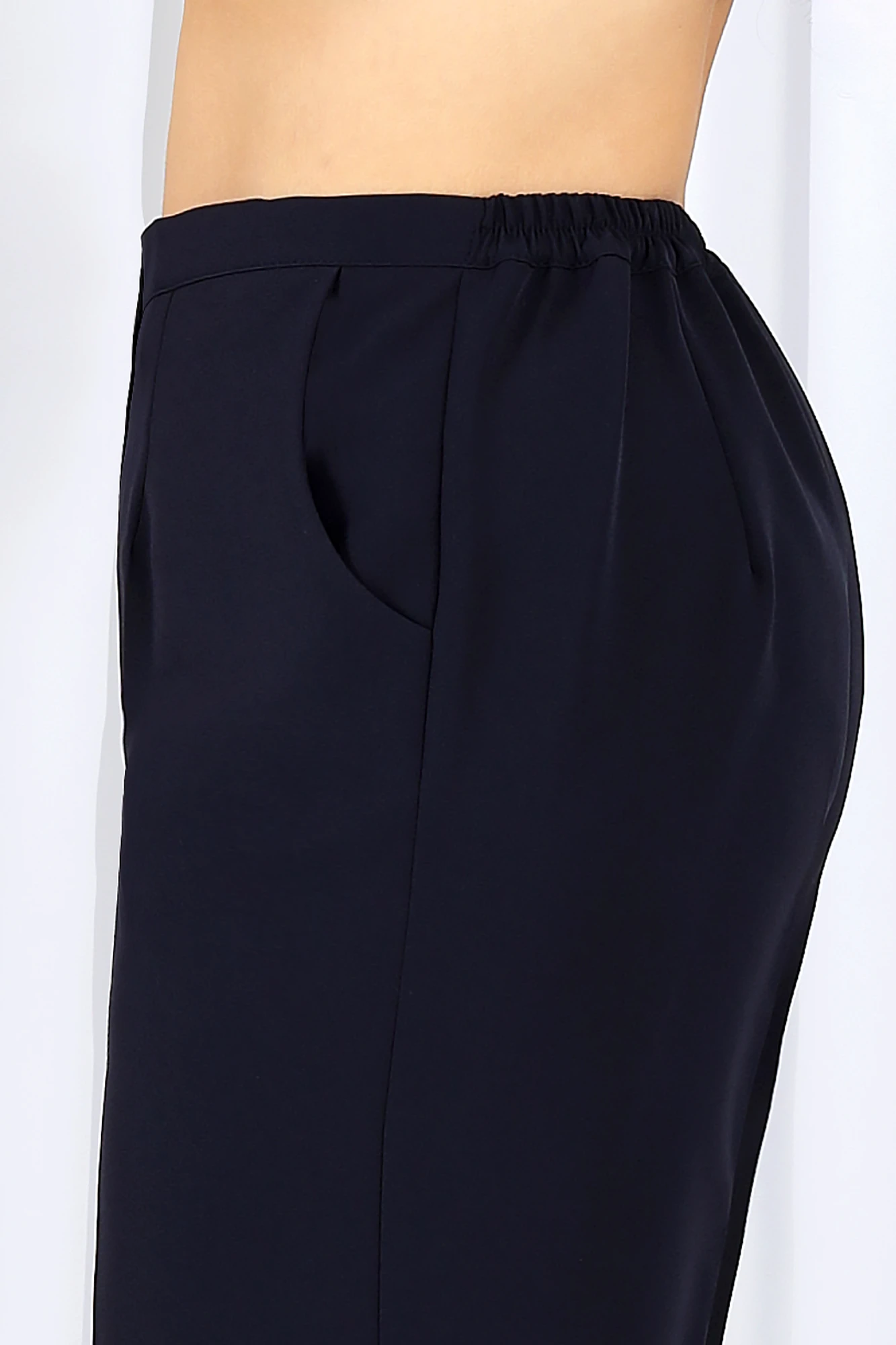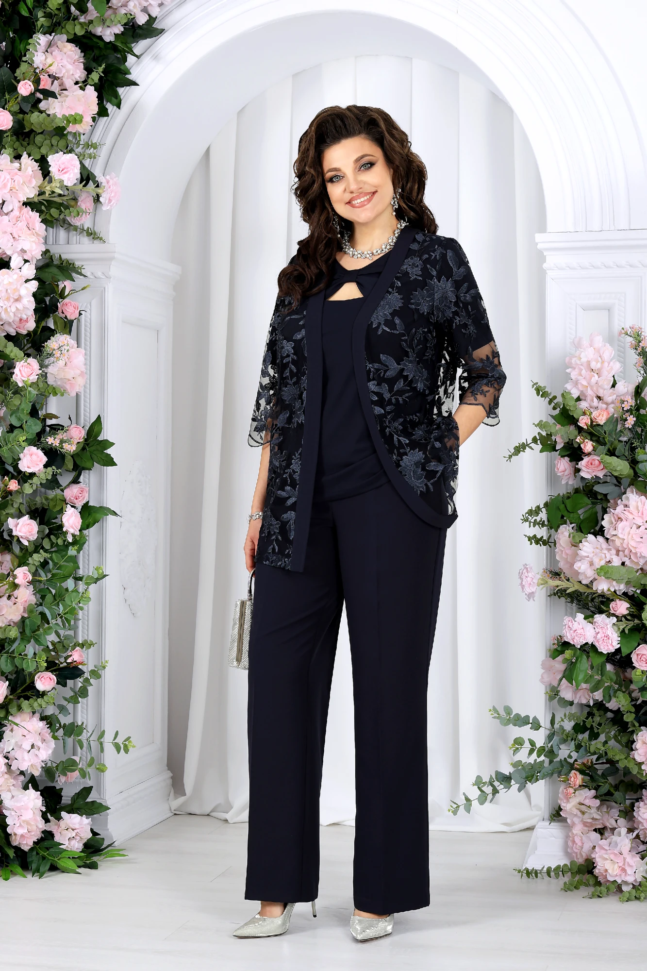 Праздничный женский костюм-тройка — гармоничное сочетание элегантности, комфорта и идеальной посадки для женщин с выразительными формами. Модель создана для тех, кто ценит стиль и практичность: она подходит как для торжеств, так и для деловых мероприятий. Главное украшение комплекта — нарядный гипюровый кардиган с фестонами по краю рукавов. Прозрачная текстура изящно подчеркивает фигуру, а насыщенный цвет добавляет образу свежести и праздничности. Такой костюм универсален: он уместен на свадьбе, юбилее, корпоративе, в театре или на важной встрече. Легко сочетается с классической обувью и аксессуарами. Комплект брючный 3-х предметный, состоящий из кардигана, блузки и брюк. Кардиган прямого силуэта, выполнен из гипюра. Модель без застежки, без подкладки и плечевых накладок. Перед с нагрудными вытачками, направленными от пройм. Горловина спинки и край борта оформлены отрезной планкой из костюмно-плательной ткани. Рукав трехчетвертной, с фестонами по низу. Длина кардигана –73 см; длина рукава – 44 см. Блузка полуприлегающего силуэта, выполнена из трикотажного полотна «масло». Модель без плечевых накладок. Перед с горизонтальным подрезом выше линии груди: нижняя часть -- с нагрудными вытачками, верхняя -- выполнена в виде имитации банта с перемычкой. Рукав короткий, втачной. Длина блузки-57 см; длина рукава 23 см. Брюки классические, длинные, с посадкой на талии, выполнены из костюмно- плательной ткани. Модель со стрелками. Передние и задние половинки брюк с талиевыми вытачками, направленными от пояса вниз. Спереди обработаны наклонные боковые карманы и центральная застёжка на тесьму-«молнию». Притачной пояс застегивается на 1 петлю и 1 пуговицу; для лучшего прилегания по линии талии в притачном поясе предусмотрена эластичная лента, вставленная по спинке. Длина брюк по боковому (с поясом) – 106 см.