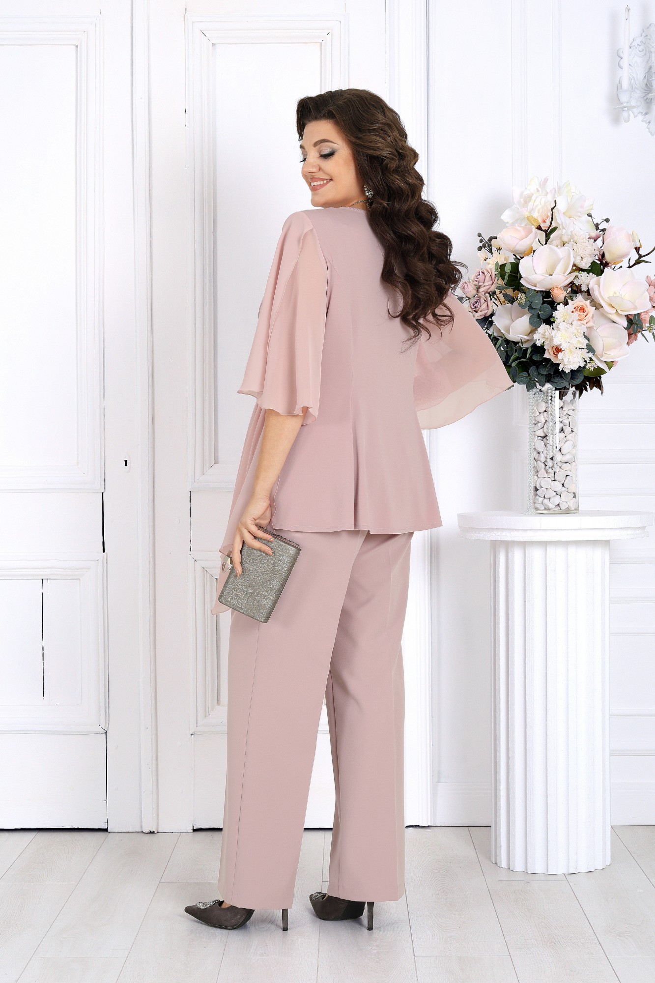 Этот костюм сочетает в себе женственность, комфорт и безупречный крой, подчеркивающий фигуру и скрывающий возможные нюансы. Воздушная блузка выполнена из мягкого трикотажа «масло» и дополнена асимметричной шифоновой деталью, создающей красивый драпирующийся силуэт. Украшение в виде страз и изящный вырез «капля» добавляют образу благородного блеска и утонченности. Легкий рукав формы «крылышко» дарит ощущение свободы и легкости движений. Классические брюки со стрелками идеально садятся по фигуре благодаря эластичной вставке в поясе и мягкой посадке на талии. Этот костюм отлично подходит для женщин с пышными формами — подчеркивает достоинства, визуально вытягивает силуэт и делает образ торжественным и уверенным. Идеален для новогодних праздников, юбилеев, вечеринок и торжеств. Комфортный и нарядный — он станет вашей любимой праздничной двойкой! Комплект брючный 2-х предметный, состоящий из блузки и брюк. Блузка полуприлегающего силуэта, выполнена из трикотажного полотна «масло». Модель без воротника и застежки. На переде и спинке обработаны рельефные швы, направленные от проймы до низа. На левой боковой части переда – горизонтальный подрез с отлетной деталью из шифона. Шов подреза декорирован тесьмой со стразами. Горловина круглой формы, окантована косой бейкой из основного полотна; спереди декорирована стразами и дополнена вырезом «капля». Рукав короткий, формы «крылышко на запах», со скругленными срезами; выполнен из шифона. Брюки классические, длинные, с посадкой на талии, выполнены из костюмно- плательной ткани. Модель со стрелками. Передние и задние половинки брюк с таллиевыми вытачками, направленными от пояса вниз. Спереди обработаны наклонные боковые карманы и центральная застёжка на тесьму-«молнию». Притачной пояс застегивается на 1 петлю и 1 пуговицу; для лучшего прилегания по линии талии в притачном поясе предусмотрена эластичная лента, вставленная по спинке.