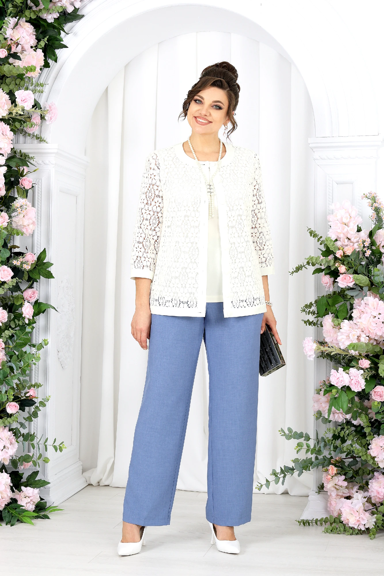 Брючный костюм 3 в 1 — утончённая элегантность на каждый день и особый случай. Этот костюм — как дыхание весны: светлый, воздушный, гармоничный. Он создан для женщины, которая выбирает не просто одежду, а настроение — легкое, уверенное и по-настоящему женственное. Кружевной жакет добавляет образу изысканности и глубины, словно тонкая работа мастера. Полупрозрачная фактура мягко играет на свету, подчеркивая деликатность и статус. Под ним — лаконичный джемпер из вискозного трикотажа, который дарит комфорт и ощущение уюта в течение всего дня. Брюки из ткани «лен-вишер» завершают образ — они держат форму, струятся при движении и создают тот самый эффект «дорогой простоты». Комплект брючный 3-х предметный, состоящий из жакета, джемпера и брюк. Жакет полуприлегающего силуэта, выполнен из кружева х/б. Модель без подкладки и без плечевых накладок. Перед с нагрудными вытачками, направленными от пройм вниз, и отрезной планкой по подборту и горловине. Жакет с центральной внешней застежкой на 8 петель и пуговиц (обтянутых основной тканью). Рукав 7/8, втачной с притачной замкнутой манжетой по низу. Низ жакета и горловина обработаны по низу притачной планкой из основной ткани. Длина жакета - 64 см (50-58 р-р); длина рукава – 45 см (50-58). Джемпер полуприлегающего силуэта, выполнен из вискозного трикотажного полотна. Горловина округлой формы, углубленная спереди. Срезы горловины и пройм окантованы косой бейкой. Длина джемпера –64 см. Брюки классические, с посадкой на талии, выполнены из ткани «лен-вишер». Модель без стрелок, с центральной застёжкой на тесьму-«молнию», на притачном поясе, застегивающемся на петлю и пуговицу. Задние половинки брюк с талиевыми вытачками, направленными от пояса вниз. По передним половинкам брюк застрочены складки-«защипы» по центру. Спереди обработаны боковые наклонные карманы. Для лучшего прилегания брюк в области талии в поясе по задним половинкам вставлена эластичная лента. Длина брюк по боковому (с поясом) – 107 см (50-58).