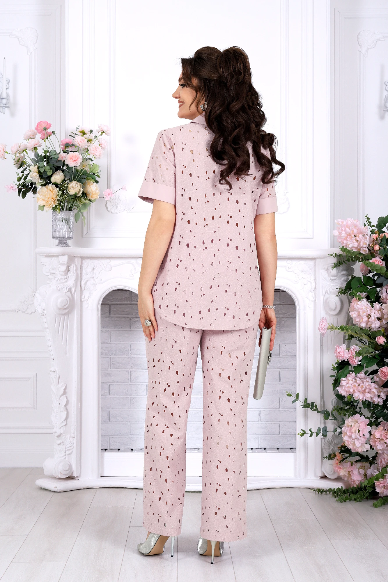 Лёгкость, которая выглядит по-настоящему нарядно. Этот праздничный брючный костюм — про элегантность без усилий. Он словно создан для особых моментов: торжеств, вечеров, встреч, где важно выглядеть безупречно и чувствовать себя уверенно. Ажурное хлопковое кружево ришелье придаёт образу утончённость, лёгкость и благородную нарядность. Блузка прямого силуэта с отложным воротником и аккуратной планкой на пуговицах формирует собранный, стильный образ. Удлинённая спинка визуально вытягивает силуэт, а короткий рукав с манжетой делает модель идеальной для весенне-летнего сезона. Натуральная ткань приятна к телу и позволяет коже дышать. Брюки прямого кроя с посадкой на талии создают гармоничный силуэт и дарят комфорт в движении. Эластичный пояс мягко подстраивается под фигуру, а хлопковая подкладка до колена обеспечивает удобство в течение всего дня. Практичные боковые карманы добавляют функциональности.