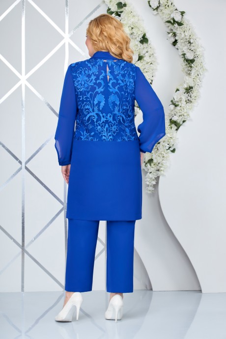 Комплект брючный, состоит из блузки, жилетки и брюк. Блузка шифоновая, свободного силуэта, длиной по среднему шву спинки 72,0 см. Нагрудные вытачки выходят из проймы. Посередине переда на вертикальной бантовой складке нашиты под наклоном бусинки. На спинке талевые выточки, в среднем шве обработана застёжка на навесную петлю пуговицу. Горловина с обтачкой, спереди углублённая, круглая. Рукава втачные, одношовные, длиной 67,0 см. Выше уровня локтя горизонтальный подрез, нижняя часть с окантованным разрезом в виде арки. Манжета притачная с застёжкой на одну горизонтальную петлю и пуговицу. Внизу боковых швов блузки разрезы. Изделие с плечевыми накладками.