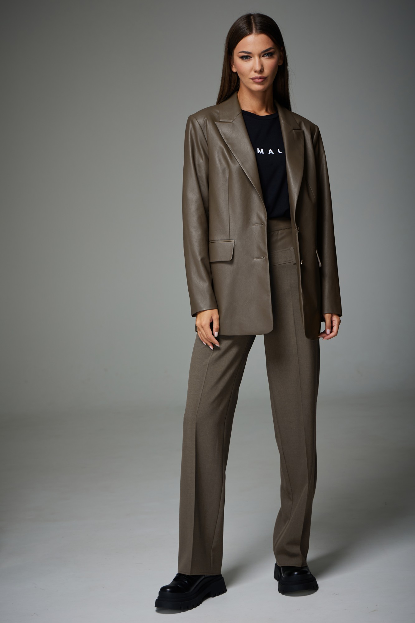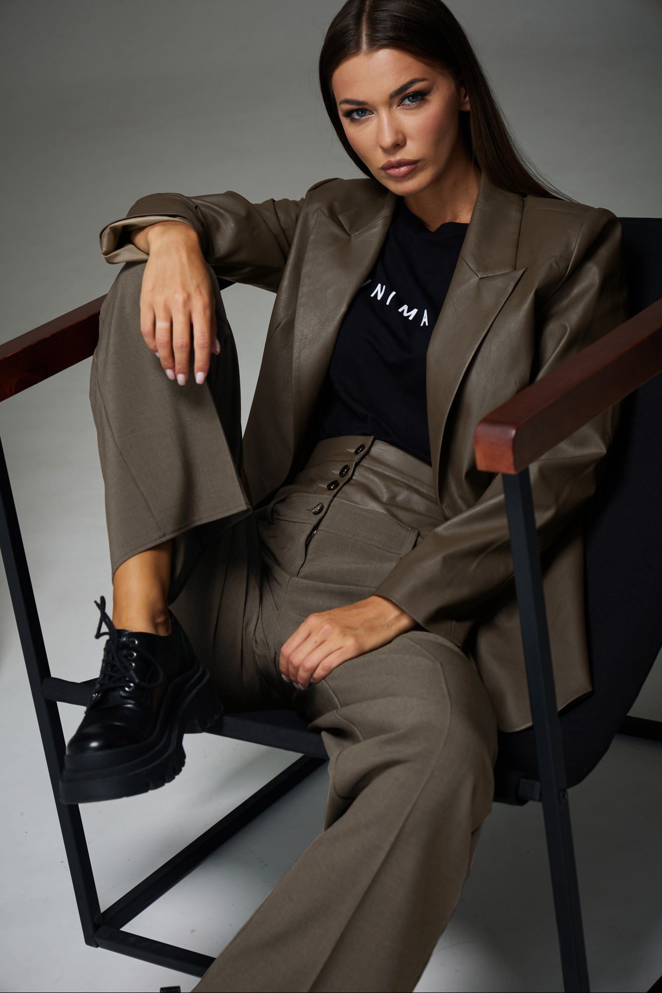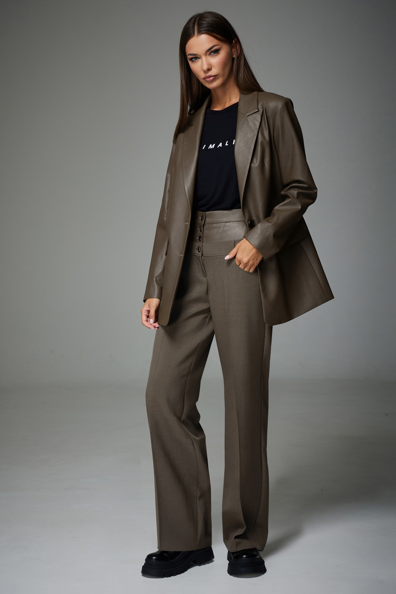 Комплект, состоящий из жакета и брюк, втачного покроя, свободного силуэта. Выполнен из двух видов ткани. Жакет прямого силуэта, на подкладке. Воротник пиджачного типа. Центрально-бортовая застежка на две пуговицы. Рукав двухшовный. Спинка со средним швом, карманы функциональные, прорезные в рамку с клапаном. Борта слегка закруглены. Брюки комбинированные из двух видов тканей, прямой формы, в области талии и бедер облегающие. В брюках заутюжены стрелки. Кокетка передней и задней половинки выполнены в тон основной ткани, пояс выполнен из экокожи. На передних половинках выполнены застежка на петли и пуговицы на гульфик. Нижний пояс в брюках выполнен из основной ткани, на поясе расположены шлевки. В боковых швах расположены карманы закругленной формы.