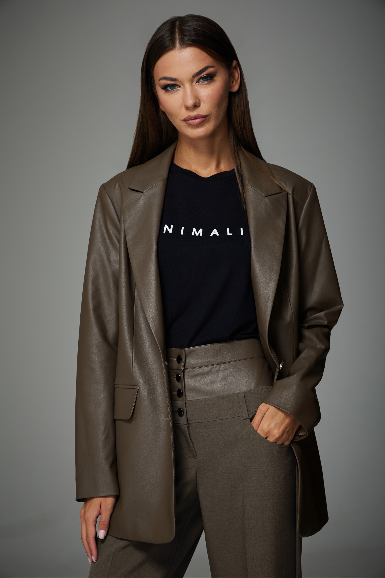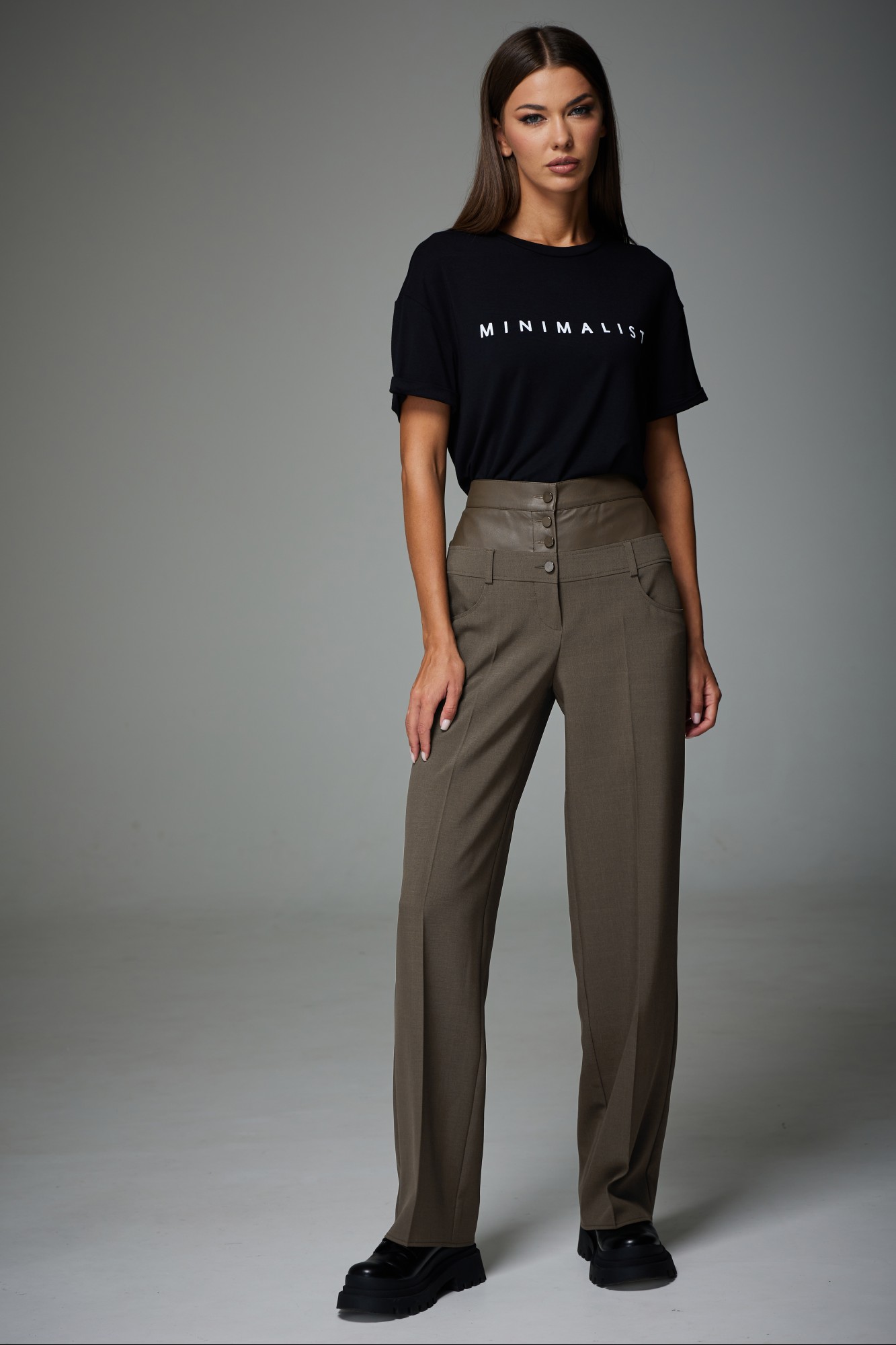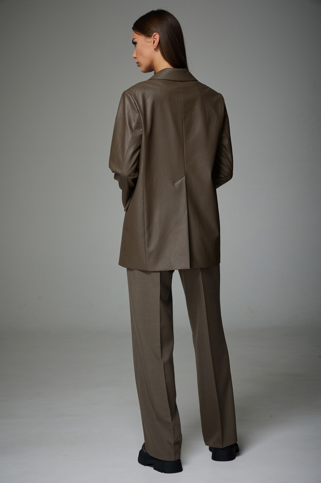 Комплект, состоящий из жакета и брюк, втачного покроя, свободного силуэта. Выполнен из двух видов ткани. Жакет прямого силуэта, на подкладке. Воротник пиджачного типа. Центрально-бортовая застежка на две пуговицы. Рукав двухшовный. Спинка со средним швом, карманы функциональные, прорезные в рамку с клапаном. Борта слегка закруглены. Брюки комбинированные из двух видов тканей, прямой формы, в области талии и бедер облегающие. В брюках заутюжены стрелки. Кокетка передней и задней половинки выполнены в тон основной ткани, пояс выполнен из экокожи. На передних половинках выполнены застежка на петли и пуговицы на гульфик. Нижний пояс в брюках выполнен из основной ткани, на поясе расположены шлевки. В боковых швах расположены карманы закругленной формы.
