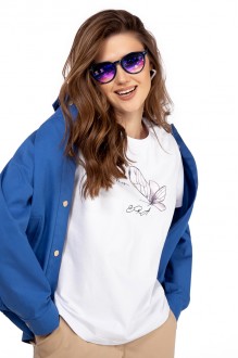 Футболка полуприлегающего силуэта, с втачными рукавами. На детали переда футболки по центру нанесена декоративная печать, вырез горловины округлой формы, с втачной бейкой. Рукава втачные одношовные короткие. Брюки зауженные к низу, с притачным поясом, в который частично вставлена эластичная тесьма. Застежка на тесьму-молнию и 1 потайной крючок. На передних половинках брюк в боковых швах обработаны наклонные карманы. На задних частях брюк расположены накладные карманы. На поясе прикреплены 5 шлёвок.