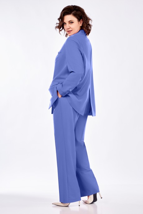 Костюм трехпредметный: жакет, блузка, брюки. Жакет прямого силуэта, на подкладке, с нагрудными вытачками, карманы с клапанами в рамку, в верхней части декоративная листочка с пуговицей, по спинке средний шов с глубокой шлицей, начинается на уровне лопаток. Рукав двухшовный, по локтевому шву шлицы с застежкой на четыре пуговицы. Блузка прямого силуэта, с нагрудными вытачками, разрезами в боковых швах, без рукава. Брюки слегка заужены к низу, на поясе, по спинке резинка, застежка на пуговицу и тесьму-молнию, с наклонными карманами к боковому шву, справа на заднем полотнище декоративный карман в рамку с пуговицей.