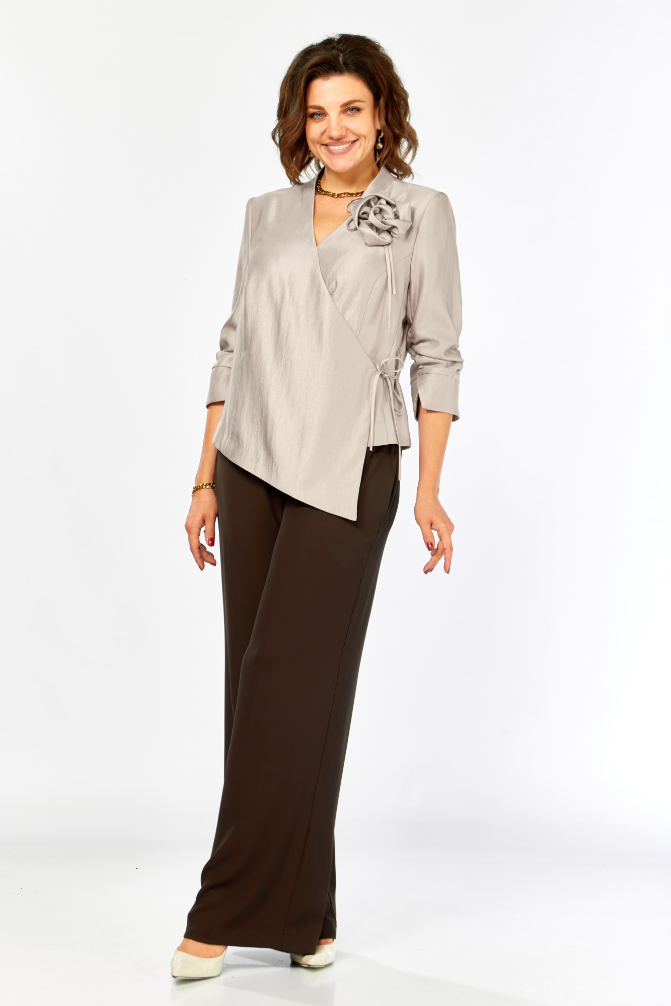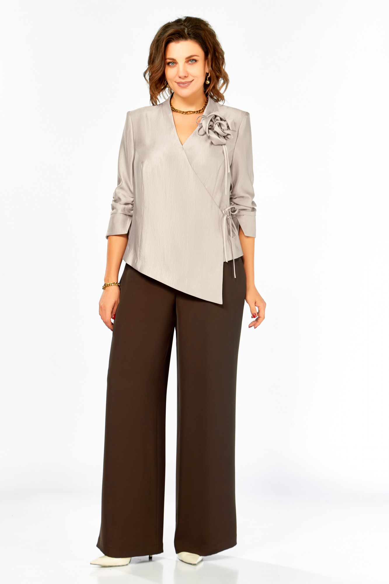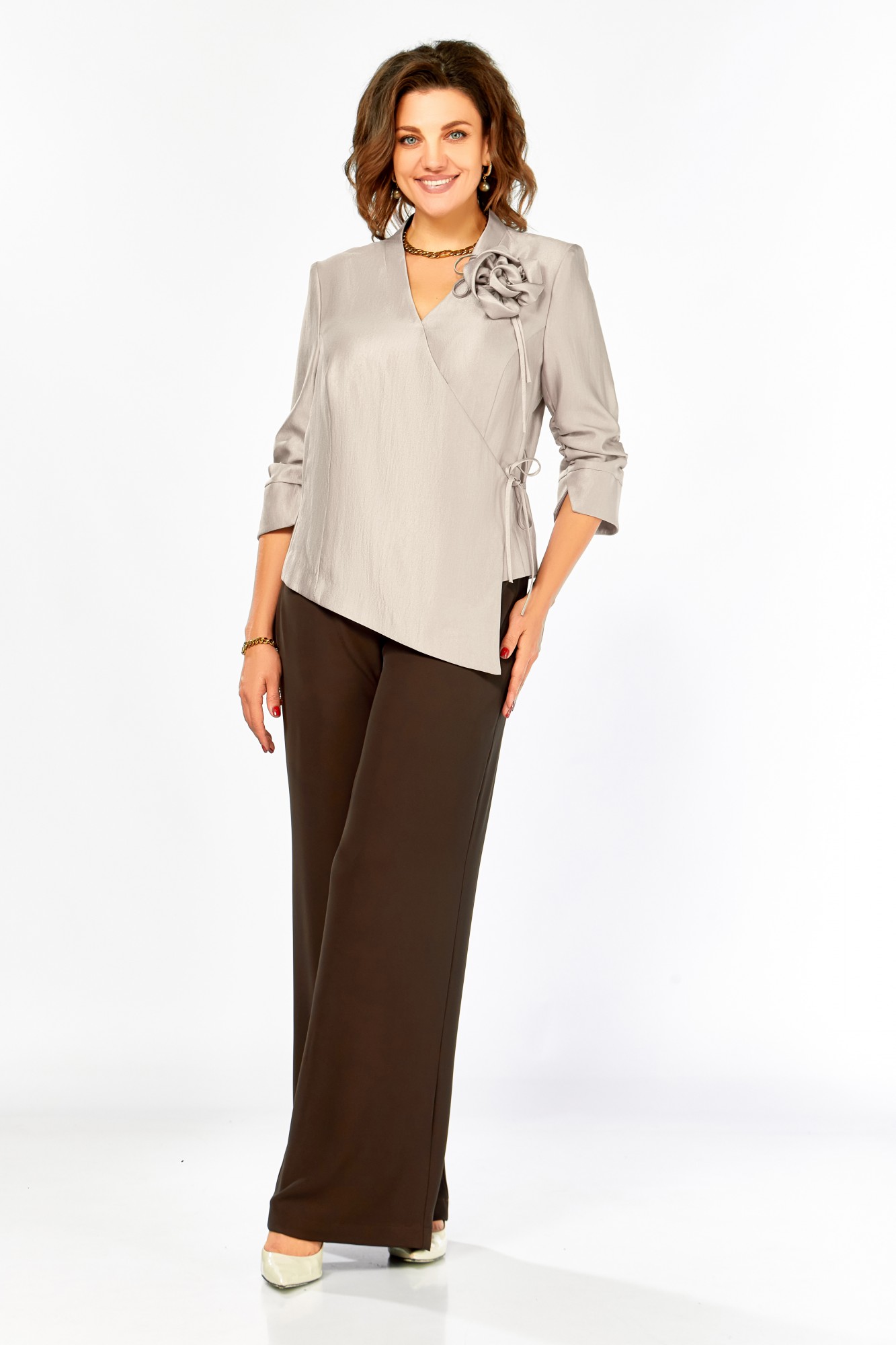 Нарядный комплект полуприлегающего силуэта. Блуза с запахом, V-образным вырезом горловины и цельнокроеной стойкой. Застежка-завязка. Спинка со средним швом и таллиевыми вытачками. Рукав 3/4, присобран, по низу фигурная манжета. Брюки прямые на поясе. Пояс по спинке на резинке. Карманы в боковых швах.