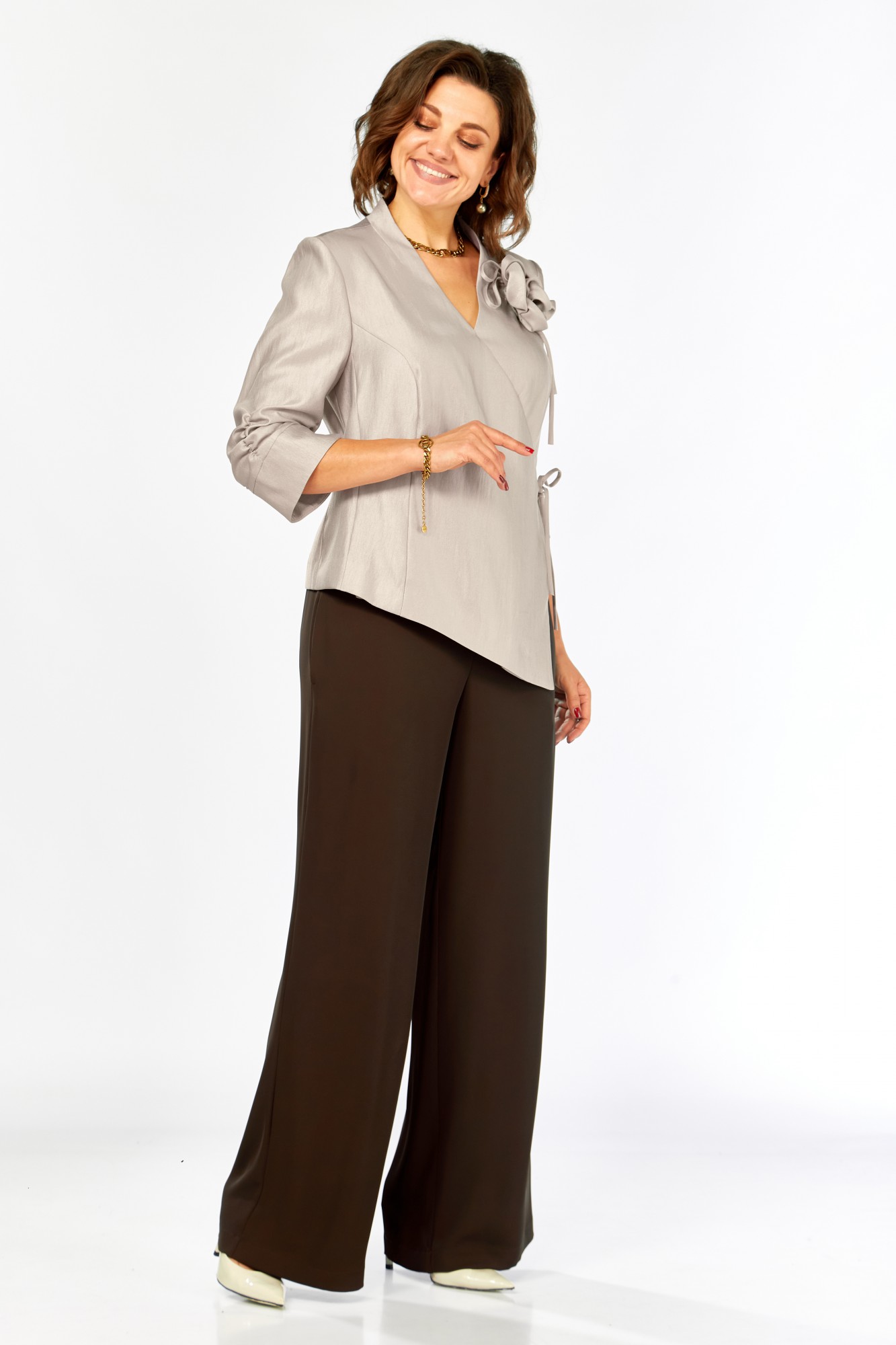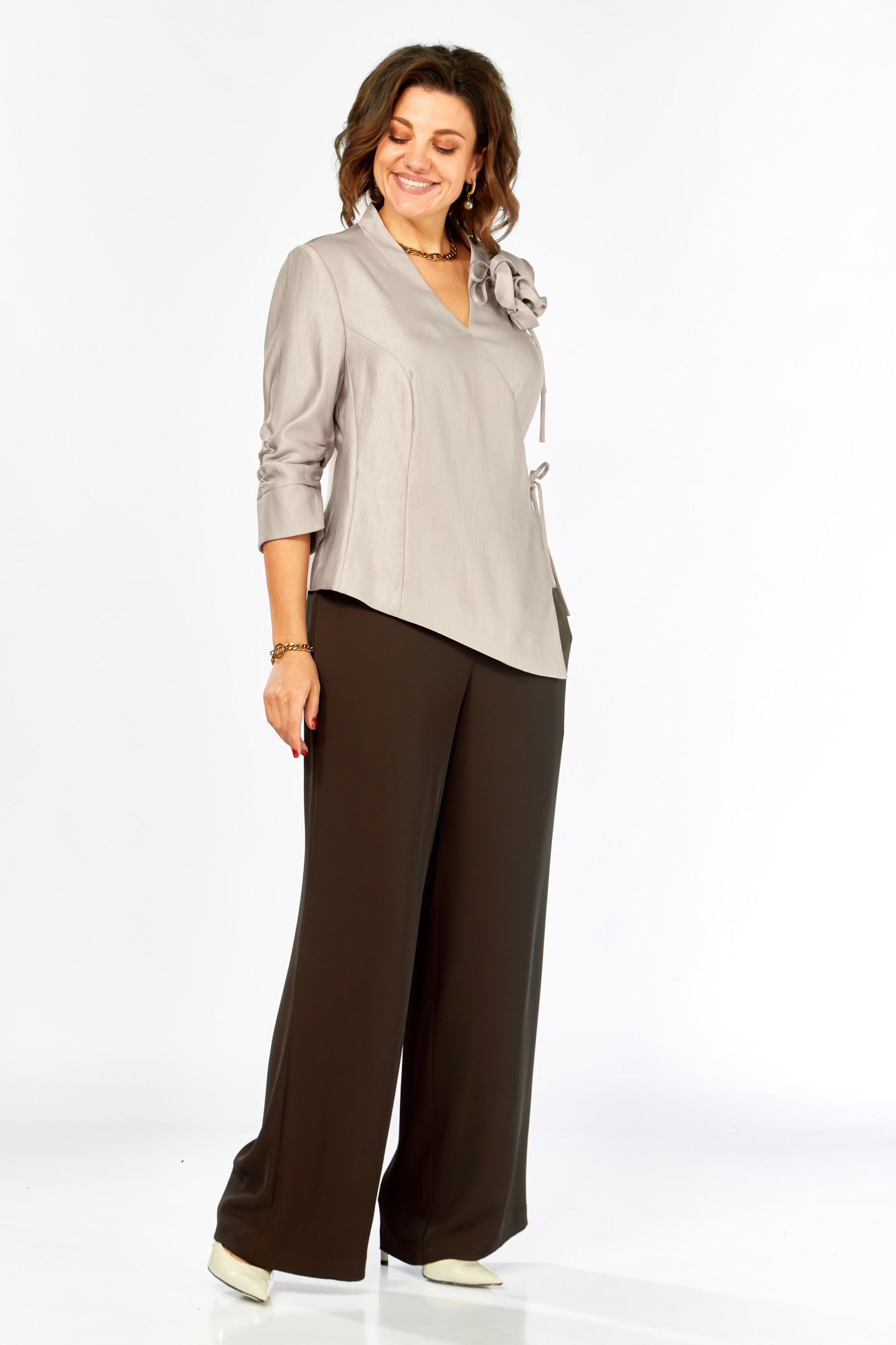 Блуза вискоза 46%, ПА 40%, ПЭ 14%, брюки ПЭ 65%, вискоза 32%, спандекс 3%