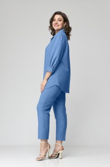 Блуза втачного покроя, полуприлегающего силуэта с центрально-бортовой застежкой, цельнокроеной планкой на петли и пуговицы. Горловина оформлена стояче-отложным воротником с отрезной стойкой. Рукава ¾ , двумя складками по низу и манжетой на одну пуговицу. Низ блузы овальной формы. На переде расположены нагрудные вытачки, идущие из бокового шва. Выше груди расположены отдельные строчки, имитирующие накладной карман и клапан.