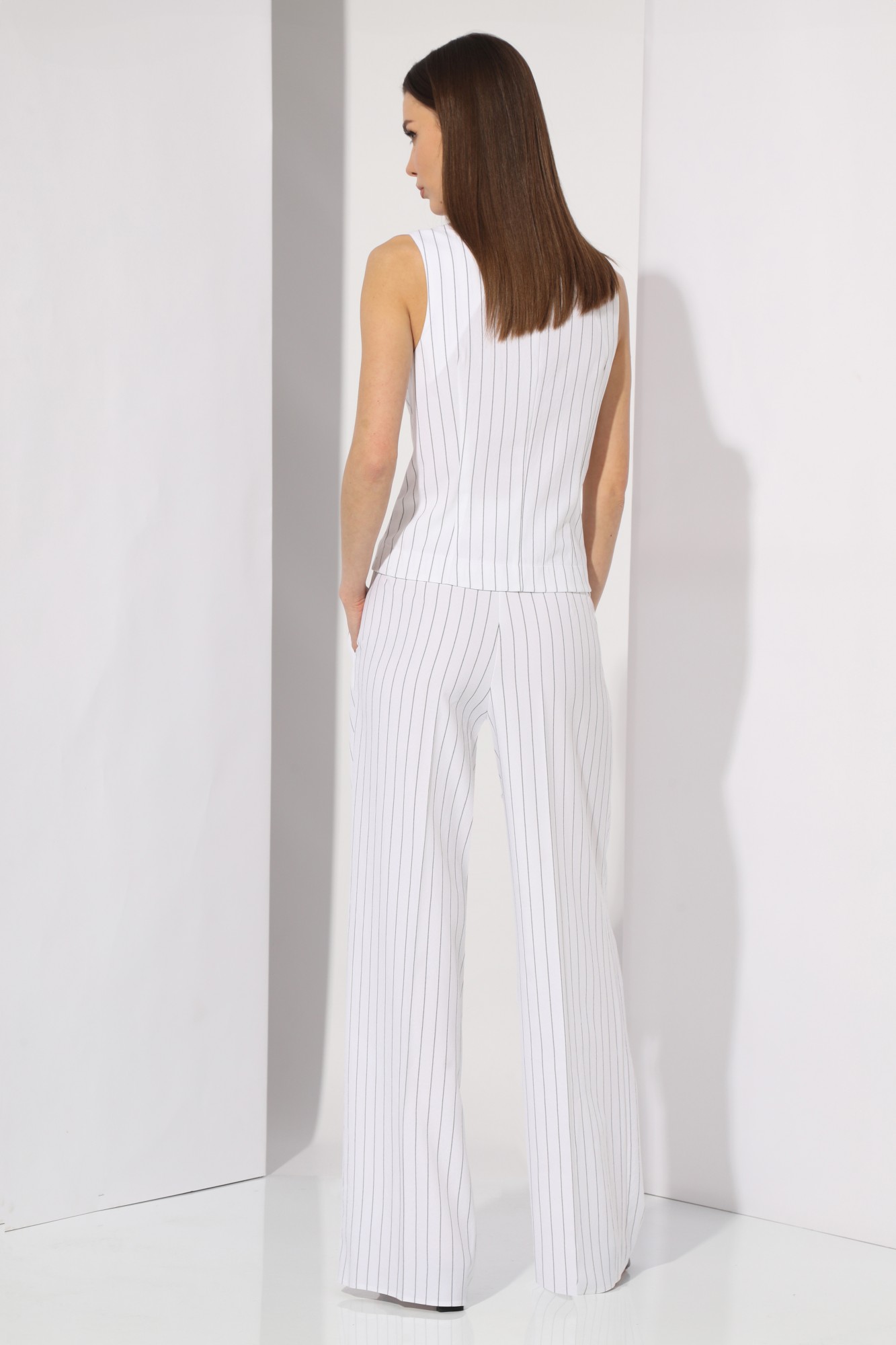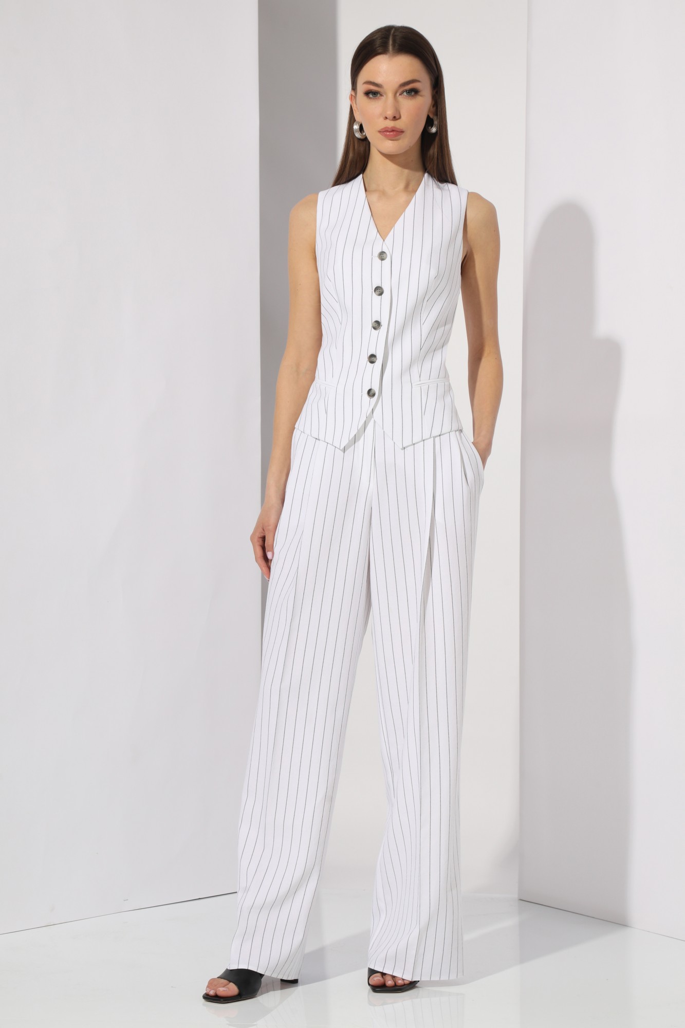 Брюки расширенного силуэта со стрелками. С притачным поясом, застегивающимся на одну петлю и пуговицу. На поясе шлевки. Застежка брюк с гульфиком на тесьму-молнию. Брюки с карманами, наклонными к боковому шву. Переднее полотнище брюк с двумя односторонними складками. Заднее полотнище брюк с талиевыми вытачками.