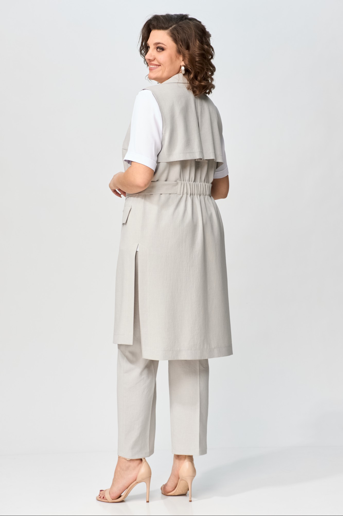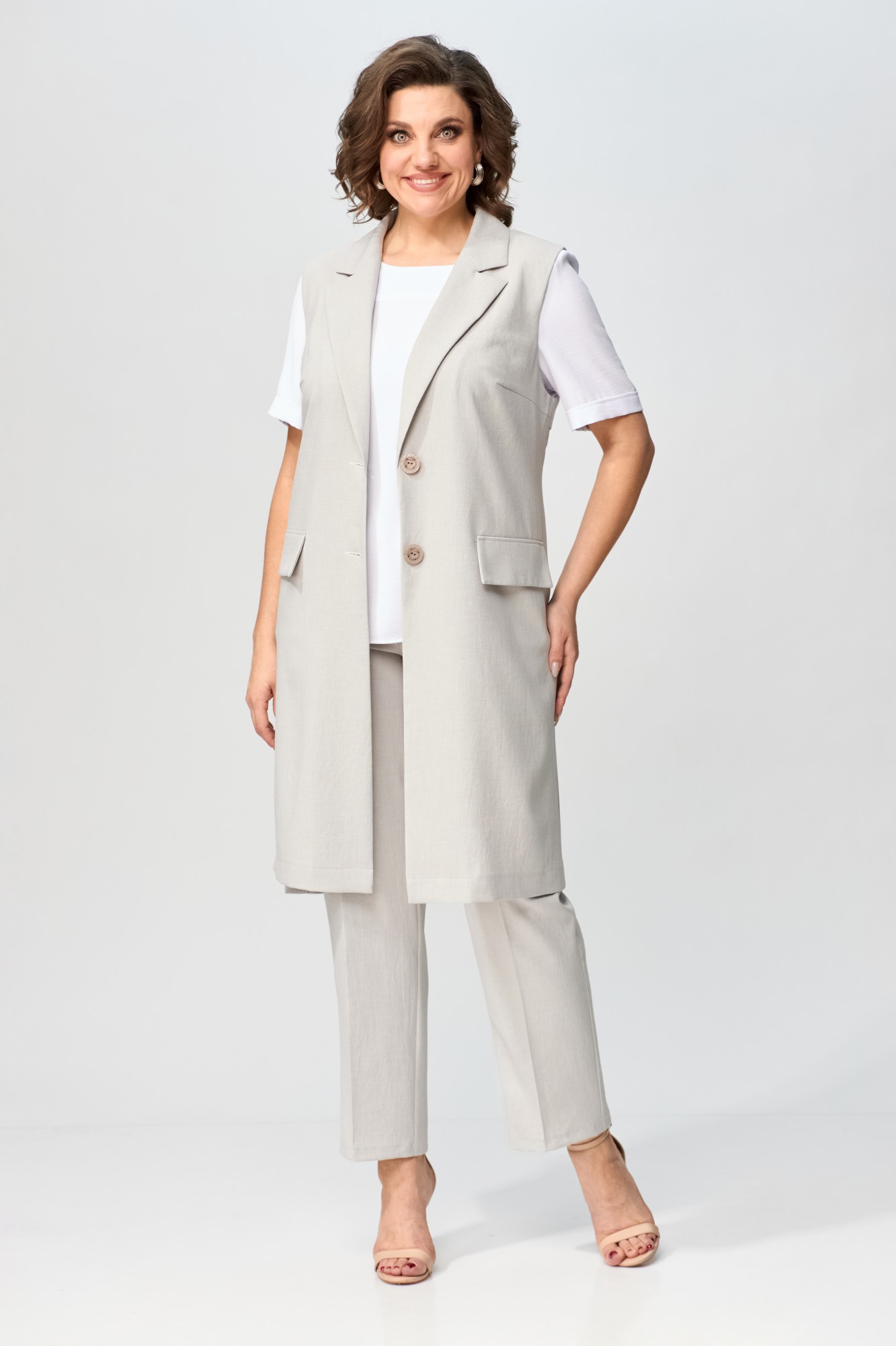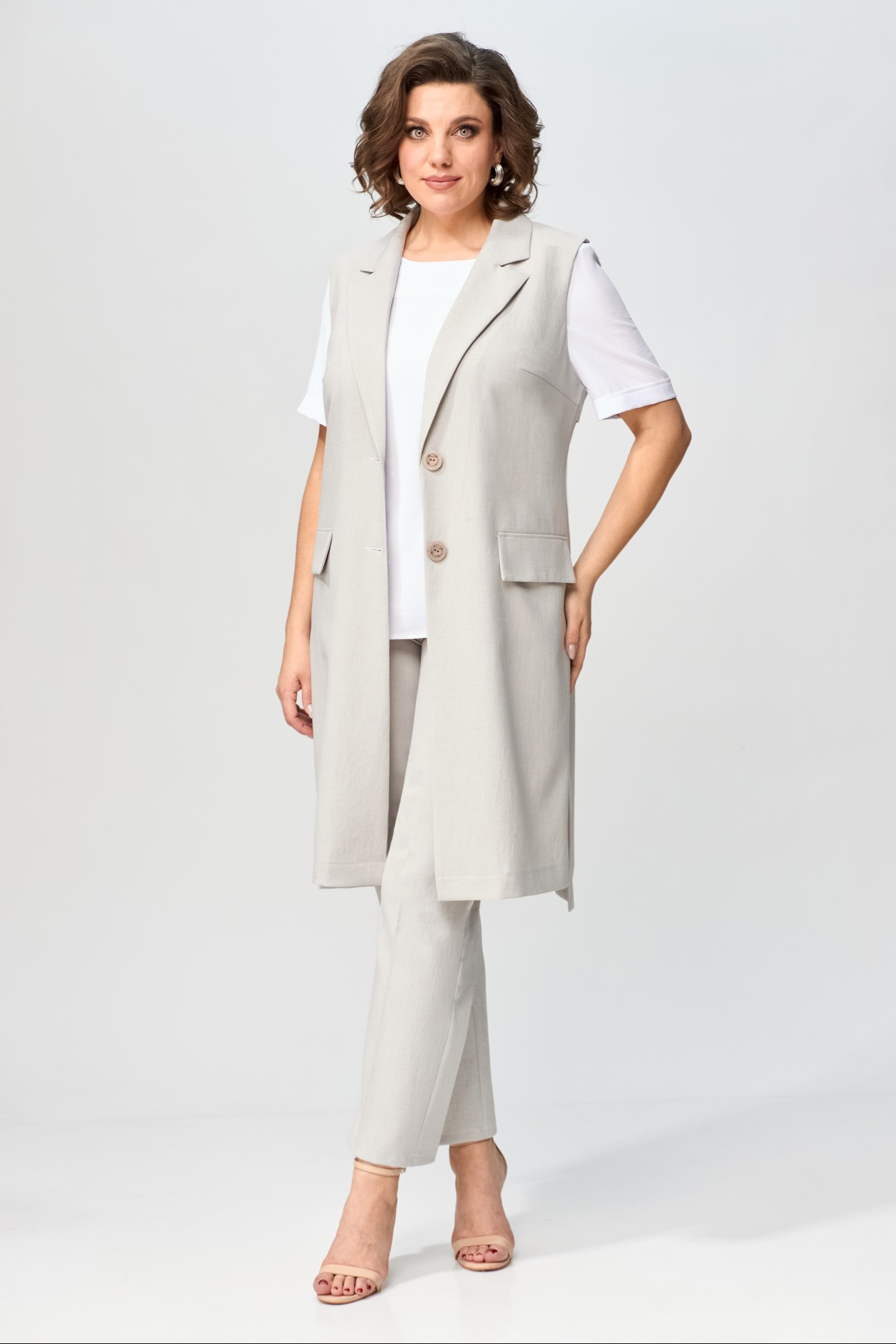 Брюки, жилет – полиэстер 55%, вискоза 42%, спандекс 3%; Блуза – вискоза 68%, эластан 29%, полиэстер 3%