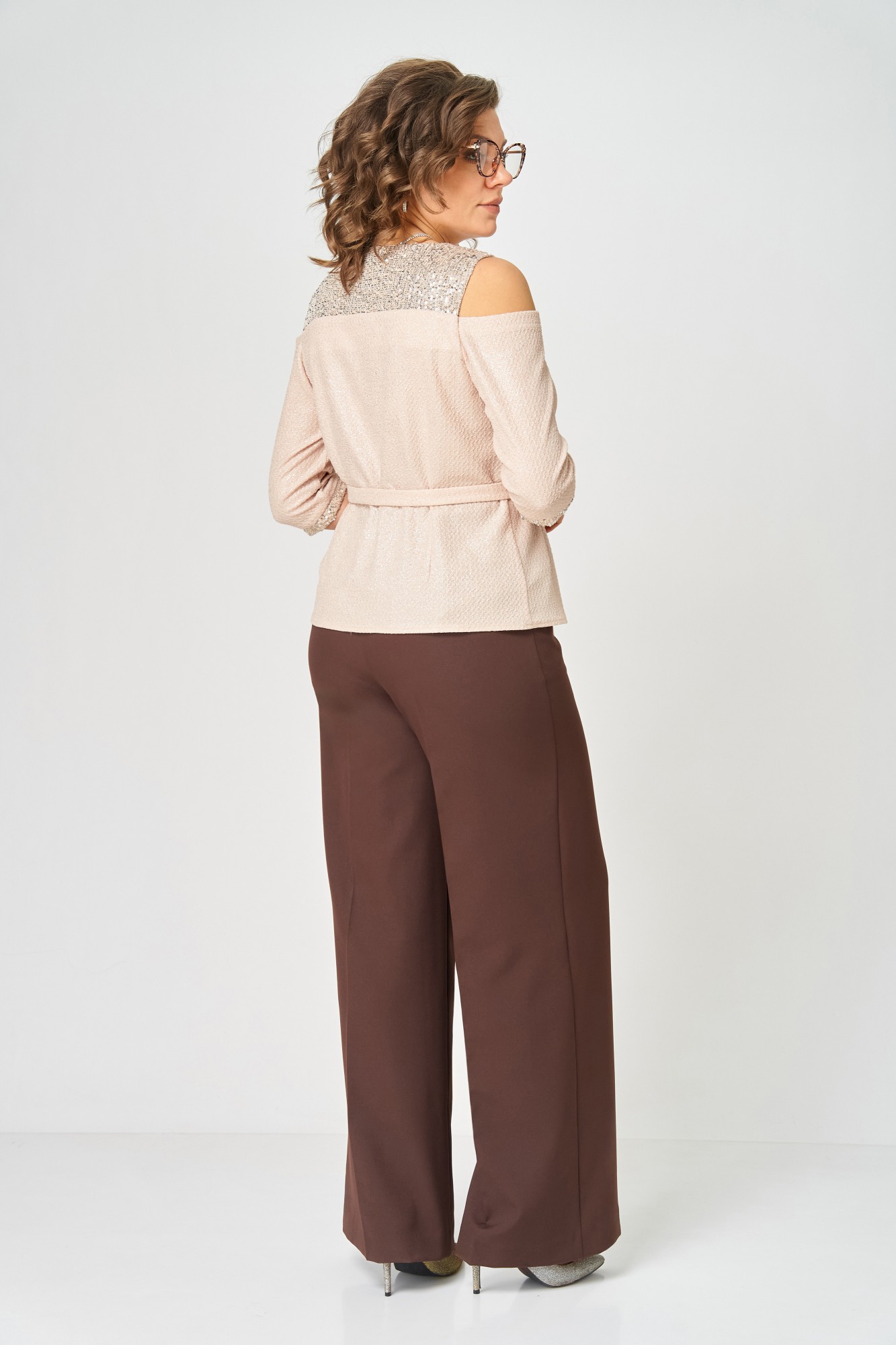 Комплект женский, состоящий из блузы трикотажного полотна с блеском и отделкой пайетки и брюк из костюмной ткани.
