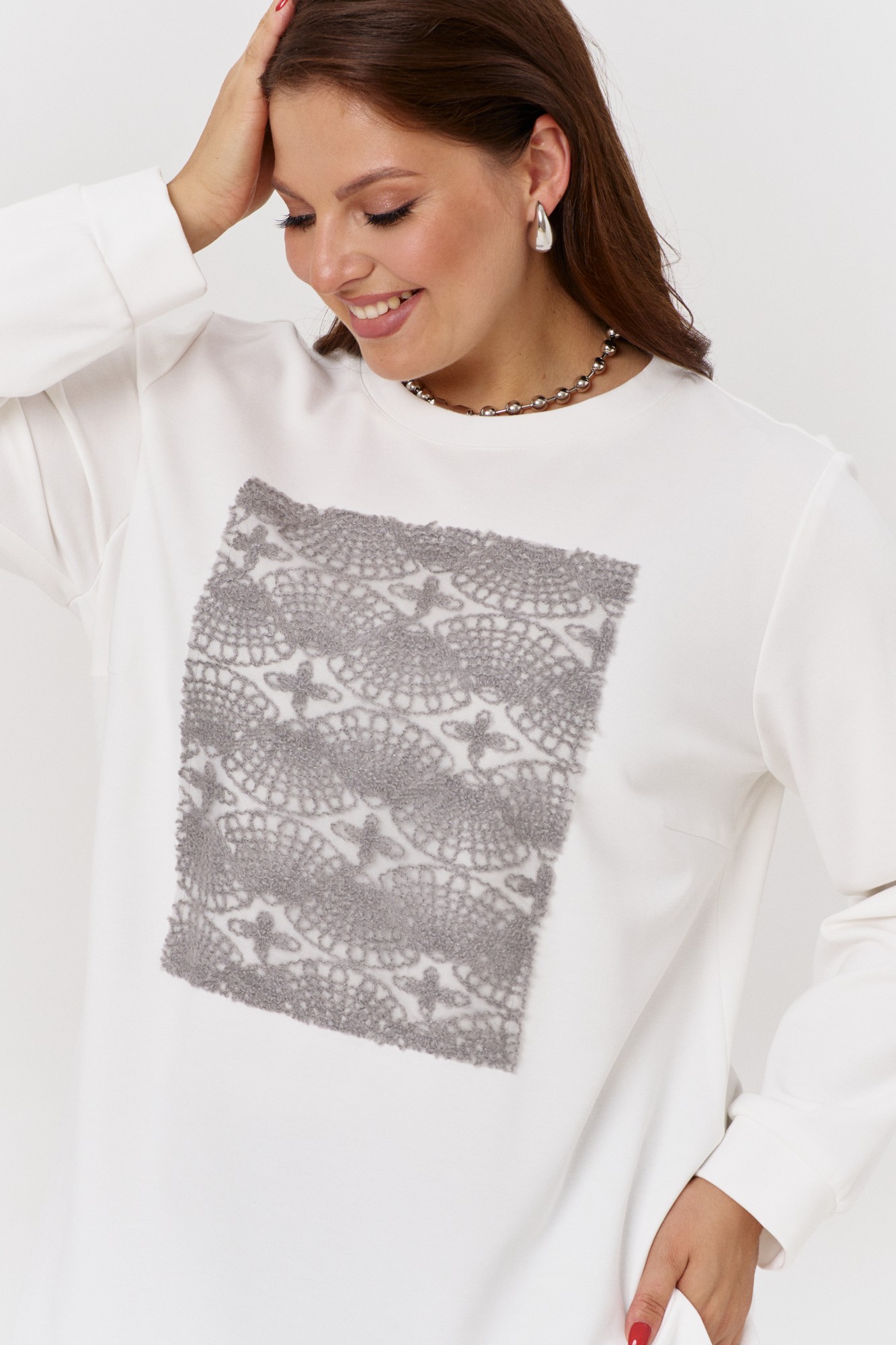 Невероятно комфортный комплект состоит из трикотажного джемпера и брюк. Джемпер свободного покроя с круглой горловиной. Рукав втачной, полномерный по обхвату, на манжете. По переду авторская вязаная аппликация шерстяным кружевом. Для удобства в боковых швах разрезы. Брюки в свободного силуэта в стиле палаццо, прямого кроя, с высокой посадкой. В боковых швах наклонные карманы. Притачной пояс на резинке. Оригинальный брючный комплект oversize благодаря качественным лекалам хорошо садится по фигуре, не мнётся, удобен для повседневной носки и прекрасно выглядит! Ткань хорошо тянется и это позволяет вам комфортно себя чувствовать. Комплект подойдет для прогулки, встречи с друзьями. Вы с удовольствием оцените крой и удобство комплекта.