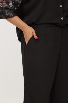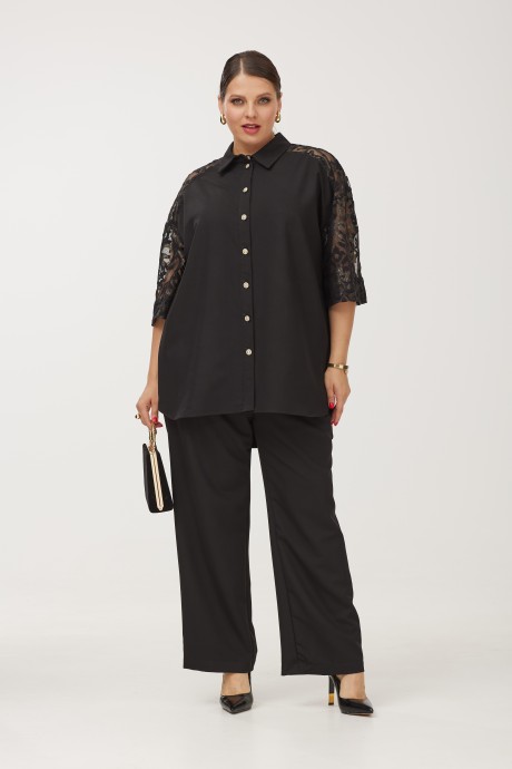 Стильный нарядный брючный костюм состоит из блузки и брюк. Блузка женская типа "рубашка", свободного силуэта, длиной ниже линии бедра, со вставкой из кружева на сетке с флоком (с блестящим напылением), по переду центральная застежка на петли-пуговицы. По спинке отрезная кокетка, от кокетки по центру заложена складка. Горловина оформлена рубашечным воротником со стойкой. Рукав кружевной, втачной, длина 3/4. Брюки женские классические, свободного силуэта, прямого кроя с высокой посадкой, с наклонными карманами в боковых швах, верхний срез оформлен поясом с эластичной резинкой. Внимание! Цветопередача фотографий может отличаться от реальности. Комплект представлен в двух вариантах: черный золотом(177) и черный с серебром (М177/1) Внимание! Цветопередача фотографий на Вашем устройстве может отличаться от реальности.