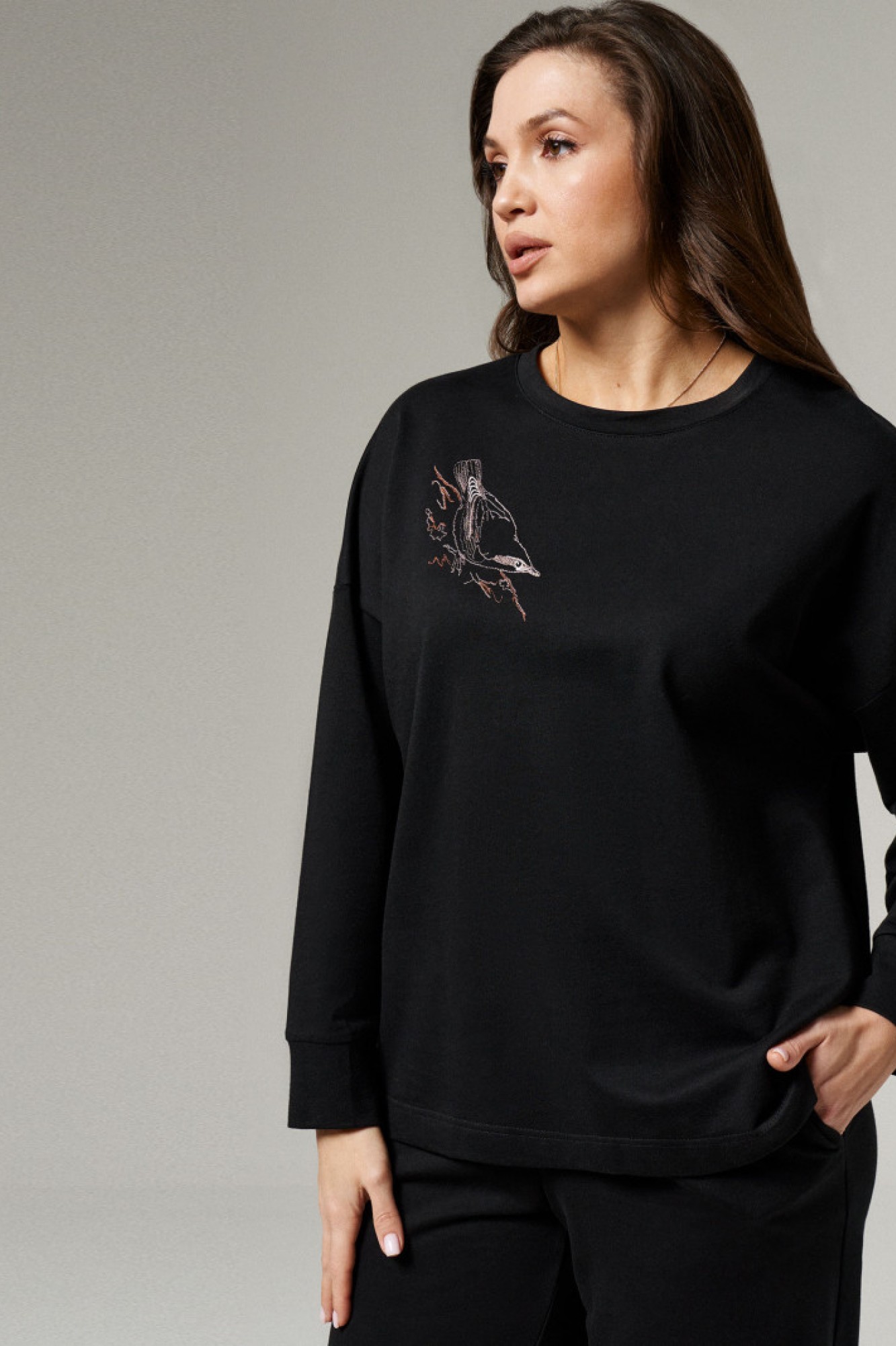 Комплект женский из хлопковой ткани для повседневной носки. В комплект входят джемпер и брюки. Брюки прямого кроя на поясе с прорезными карманами в боковых швах. Джемпер прямого кроя с длинным рукавом. Горловина джемпера круглая. По переду джемпера дизайнерская вышивка. Это отличный базовый костюм, который вы сможете носить в повседневной жизни как вместе, так и раздельно, дополняя ваш образ различными аксессуарами. Лаконичная вышивка на джемпере придает комплекту изюминку и будет выигрышно выделяться.