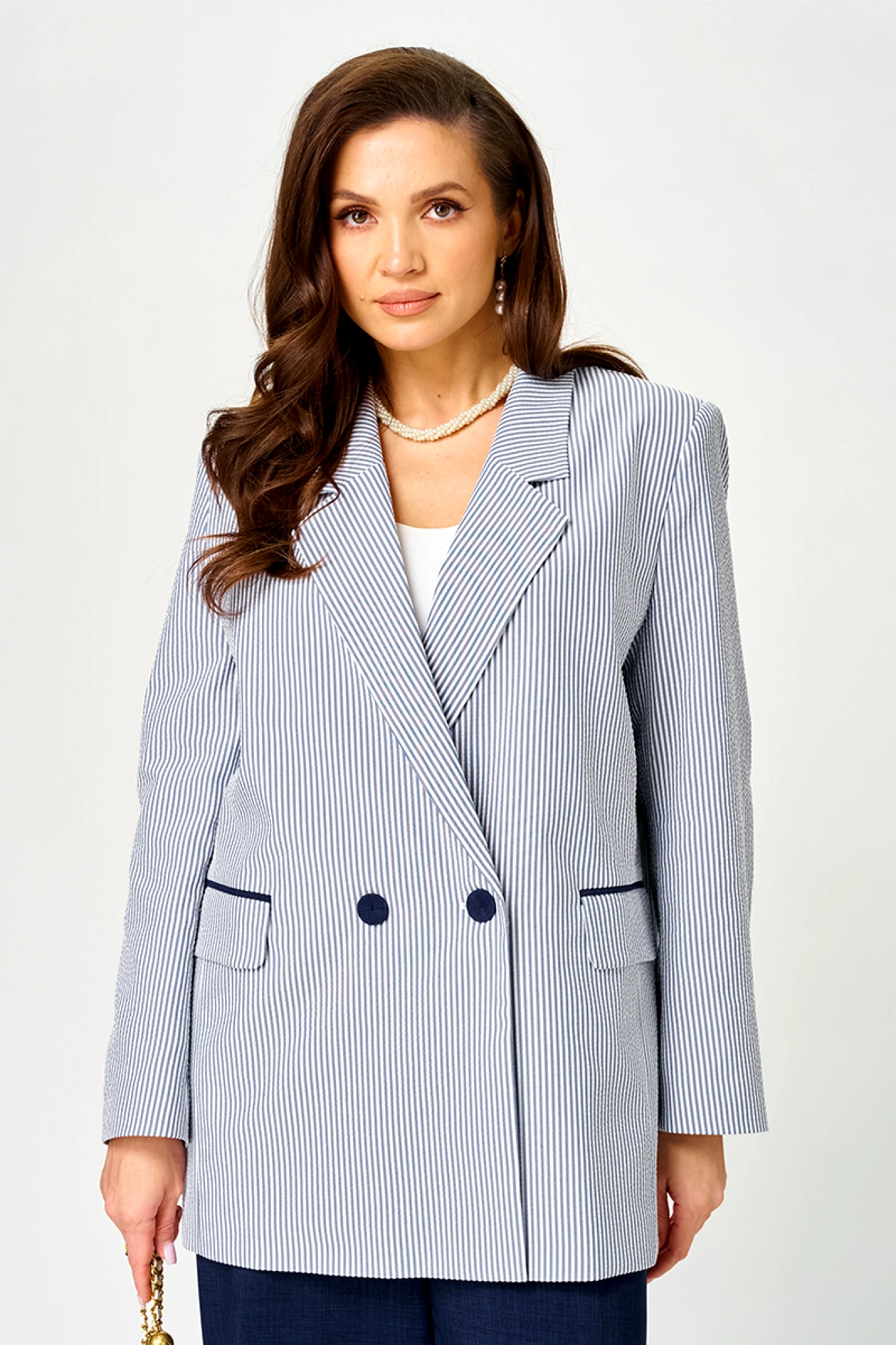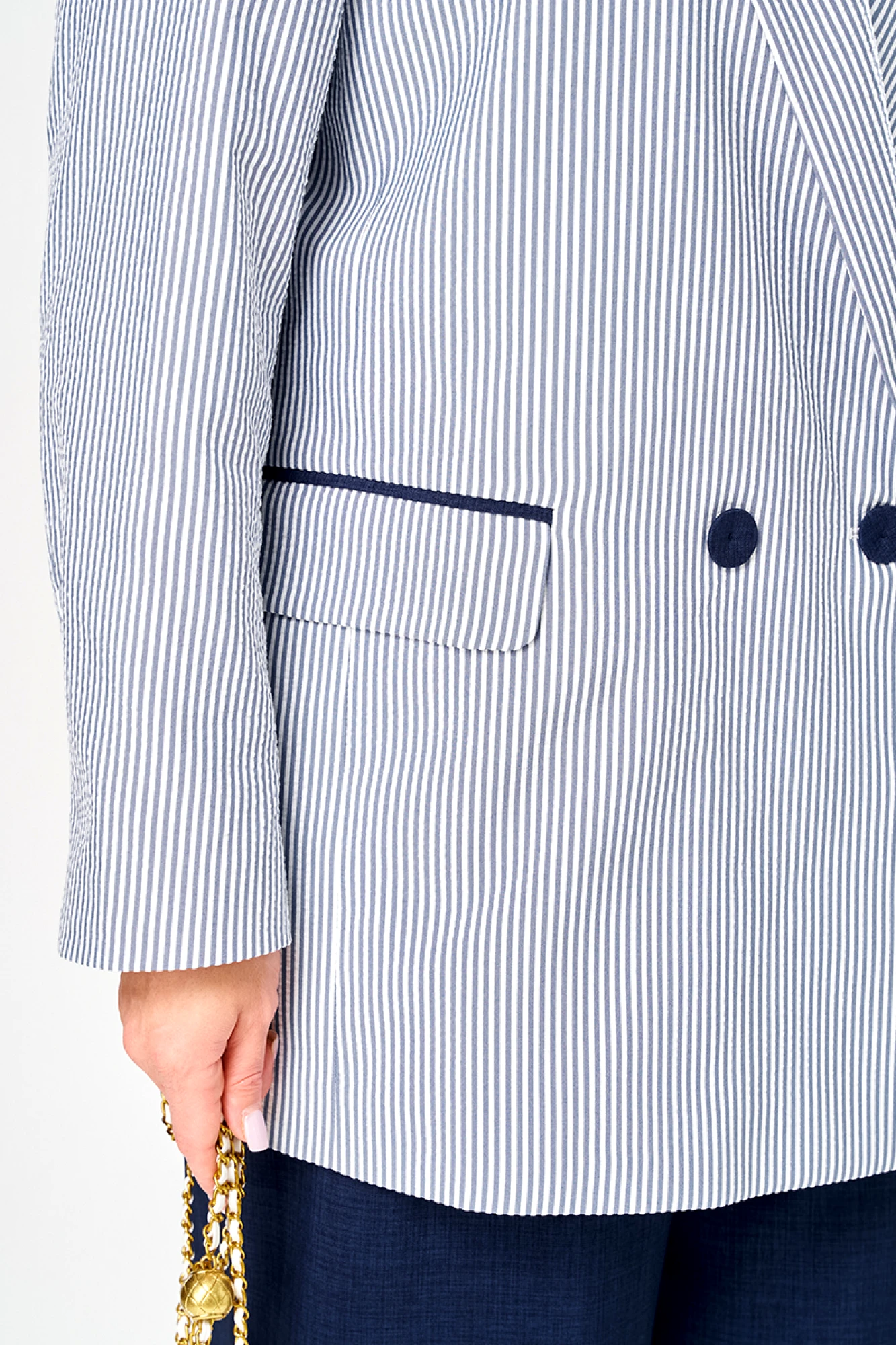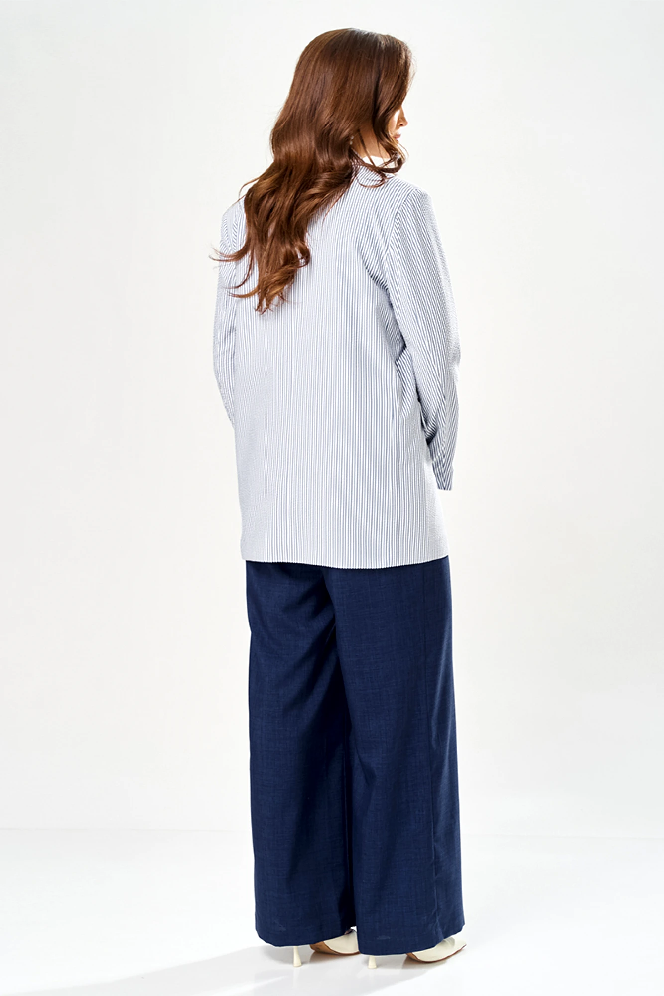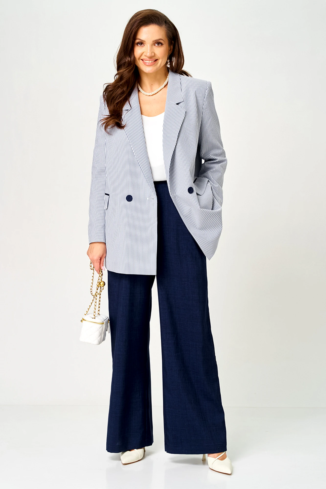 Этот женский костюм выполнен из смесовой ткани с добавлением хлопка, что обеспечивает комфорт и долговечность. Он включает в себя жакет и брюки, гармонично сочетающиеся по стилю и цвету. Жакет полуприлегающего силуэта в бело-синем оттенке с полосатым узором. Застежка в жакете двубортная на обметанные петли и обтяжные пуговицы, которые создают аккуратный и завершенный вид. На переде расположены два прорезных кармана в рамку с двумя обтачками и клапаном, и вставками из синей ткани, добавляющими интересный акцент. Спинка жакета украшена двумя средним швом. Жакет имеет бочок. Воротник выполнен в пиджачном стиле, что делает модель более строгой и классической. Рукава втачные длинные что придает образу деловой нотки и комфорт при носке. Жакет на хлопковой подкладке. Брюки прямые из смесовой ткани с добавлением льна. Верхний срез брюк обработан притачным поясом с вставкой на резинке в боковой и задней части, обеспечивая хорошую посадку и комфорт. В боковом шве имеются карманы с подкройным бочком. Это стильный и элегантный костюм бело-синего оттенка, идеально подходящий для деловых встреч и повседневных мероприятий, сочетающий в себе классические линии и современный дизайн.