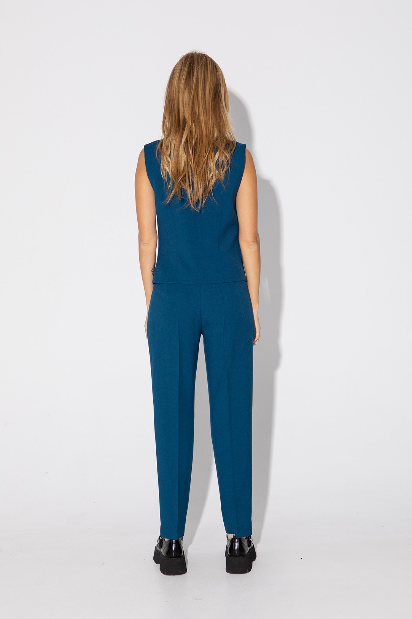 Костюм-двойка из полуприлегающего жилета и укороченных брюк со стрелками. Детали: жилет полуприлегающего силуэта, фигурный низ, талиевые вытачки, застежка на петли и пуговицы, функциональные карманы, на подкладке. Брюки со средней посадкой, притачной пояс со шлевками, передние половины с небольшими мягкими складками и заутюженными стрелками, застежка на молнию и пуговицу, боковые карманы.