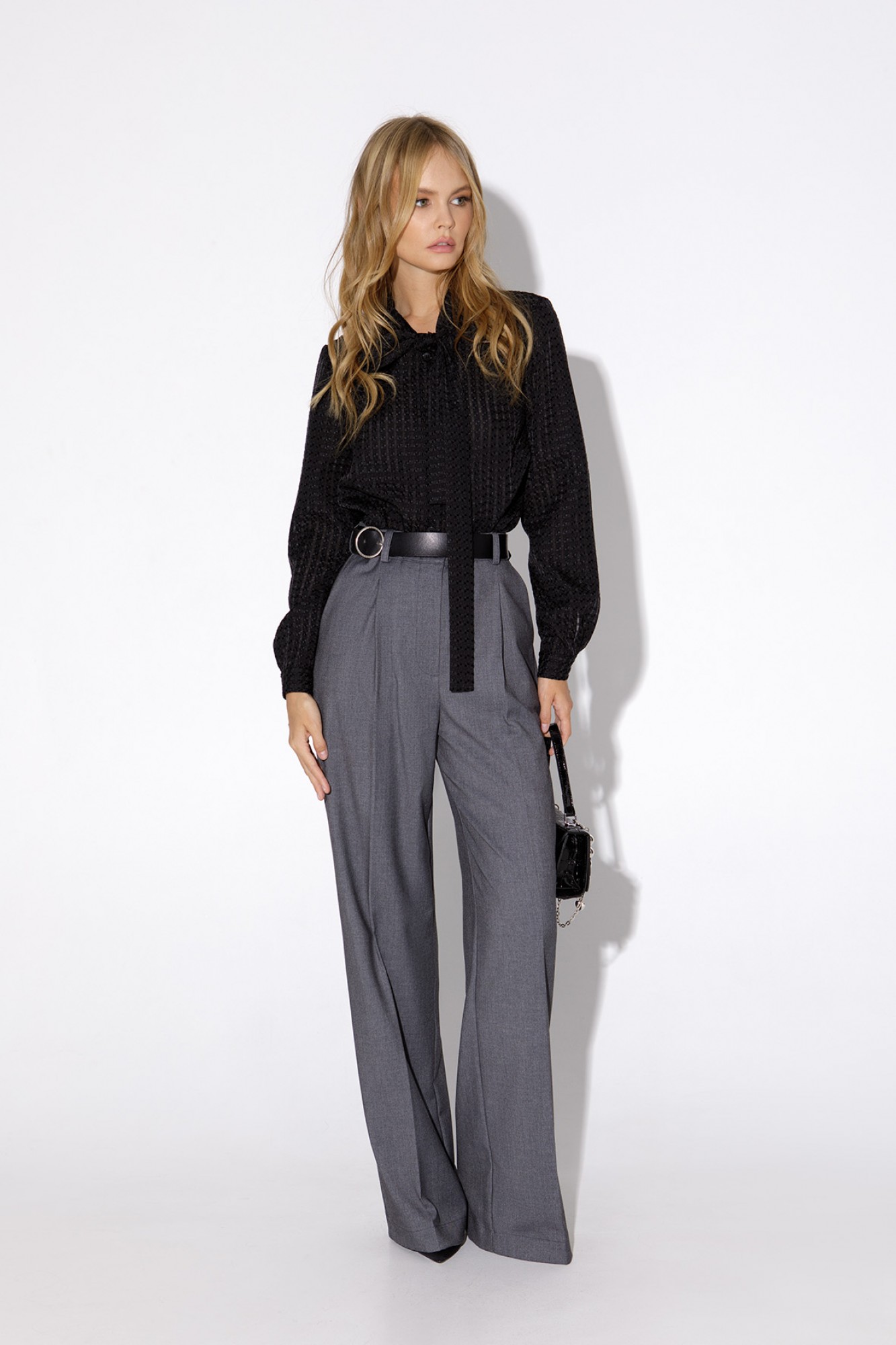 Текстильный комплект-двойка из полупрозрачной блузы с воротником-аскот и прямых брюк со стрелками. Детали: блуза прямого силуэта, застежка на петли и пуговицы, длинные рукава с притачными манжетами. Брюки с высокой посадкой на притачном поясе со шлевками, передние половины с небольшими застроченными мягкими складками и заутюженными стрелками, застежка на молнию и пуговицу, боковые карманы.