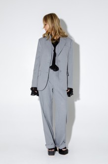 Костюм-тройка из оверсайз жакета, укороченного жилета и прямых широких брюк со стрелками из текстильной ткани. Детали: жакет прямого силуэта, расширенная линия плеч, пиджачный воротник, перед с прорезными функциональными карманами, однобортная застежка на петли и пуговицы, спинка со средним швом и шлицей, рукава втачные двухшовные, жакет на подкладке. Жилет прямого силуэта с фигурным низом, талиевые вытачки, застежка на петли и пуговицы, функциональные карманы, на подкладке. Брюки с высокой посадкой на притачном поясе со шлевками, пояс прямой без резинки, застежка на молнию и пуговицу, боковые карманы, передние половины с заутюженными стрелками и двумя небольшими складками. Задние части брюк с вытачками и заутюженными стрелками.