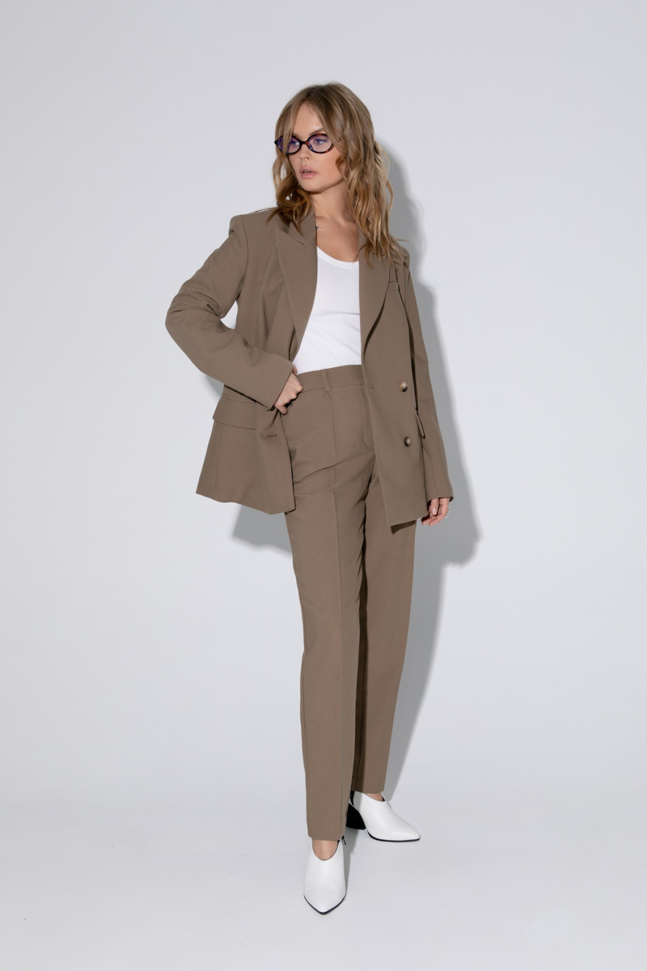 Костюм-двойка из свободного двубортного жакета и классических-брюк из текстильной ткани.