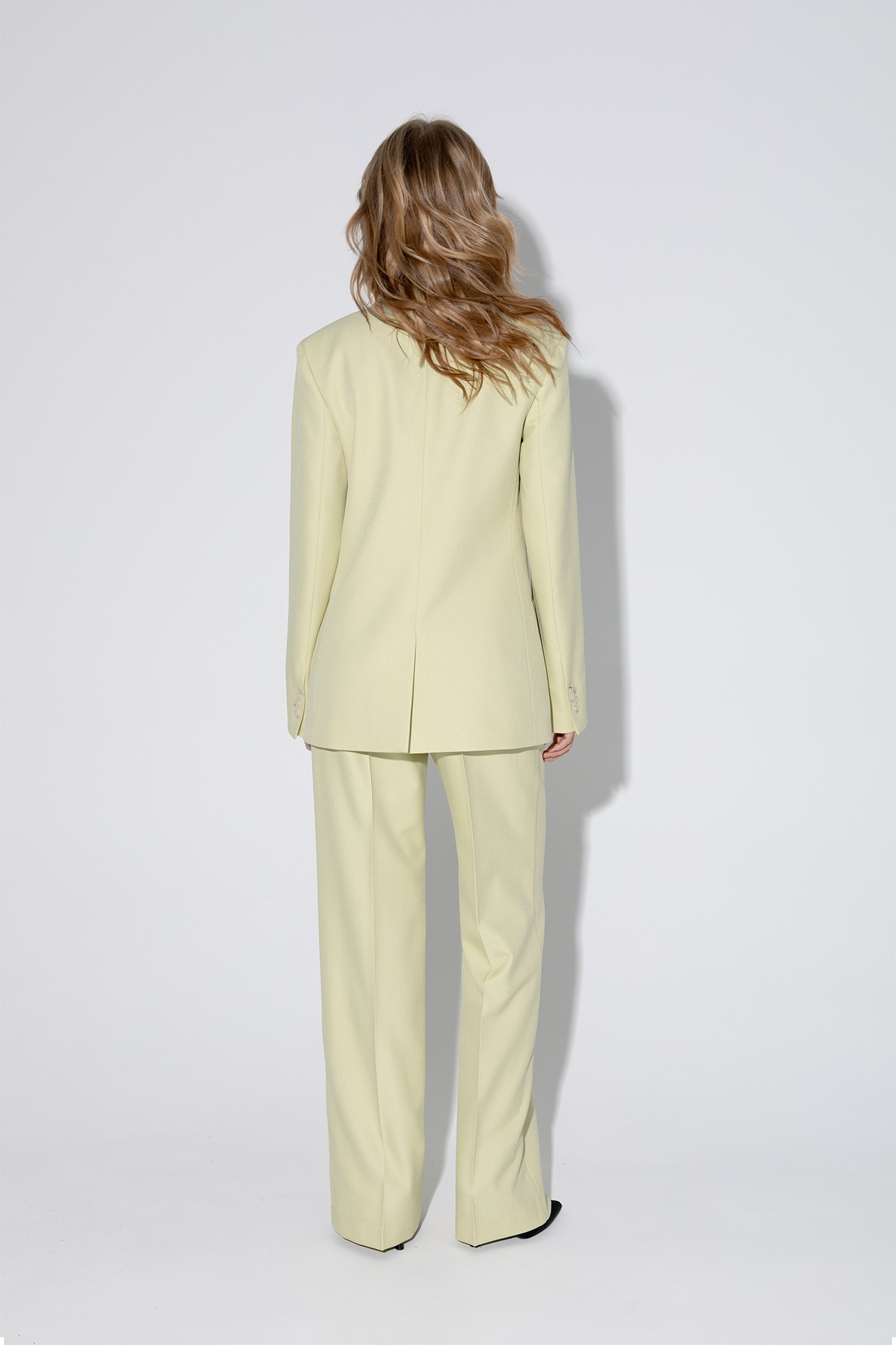 Текстильный костюм-двойка из свободного жакета и прямых брюк со стрелками.