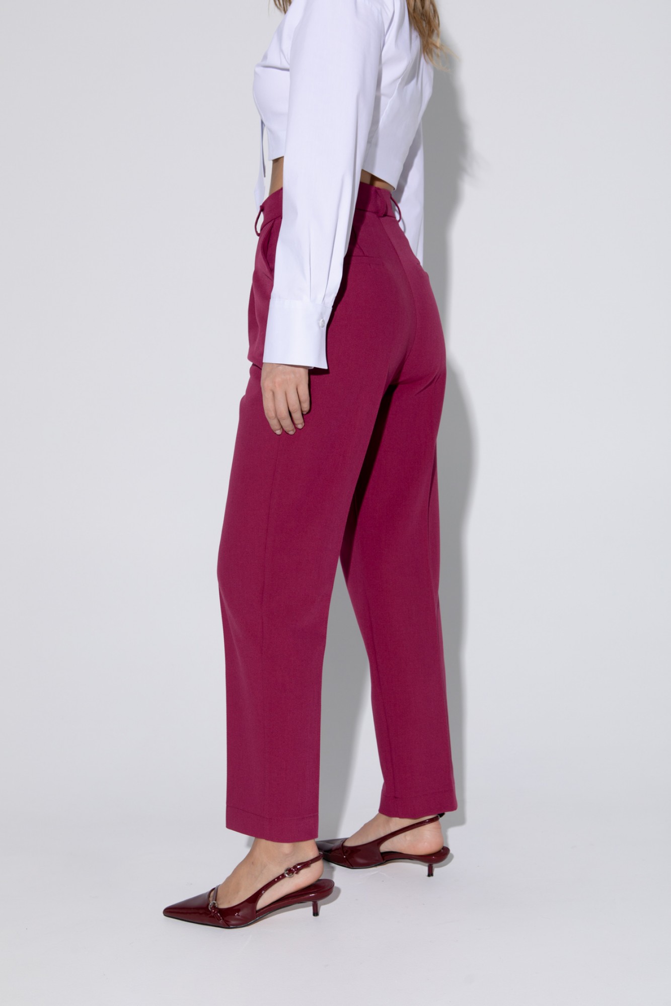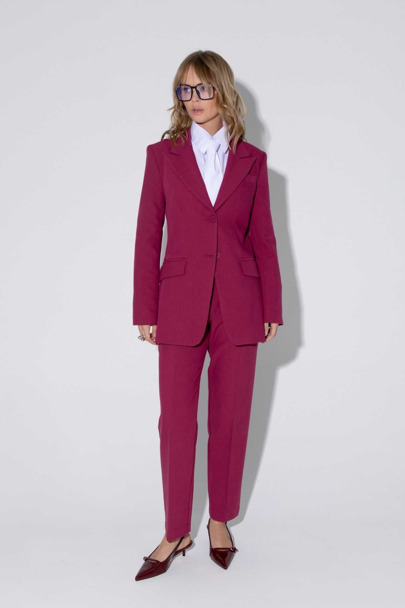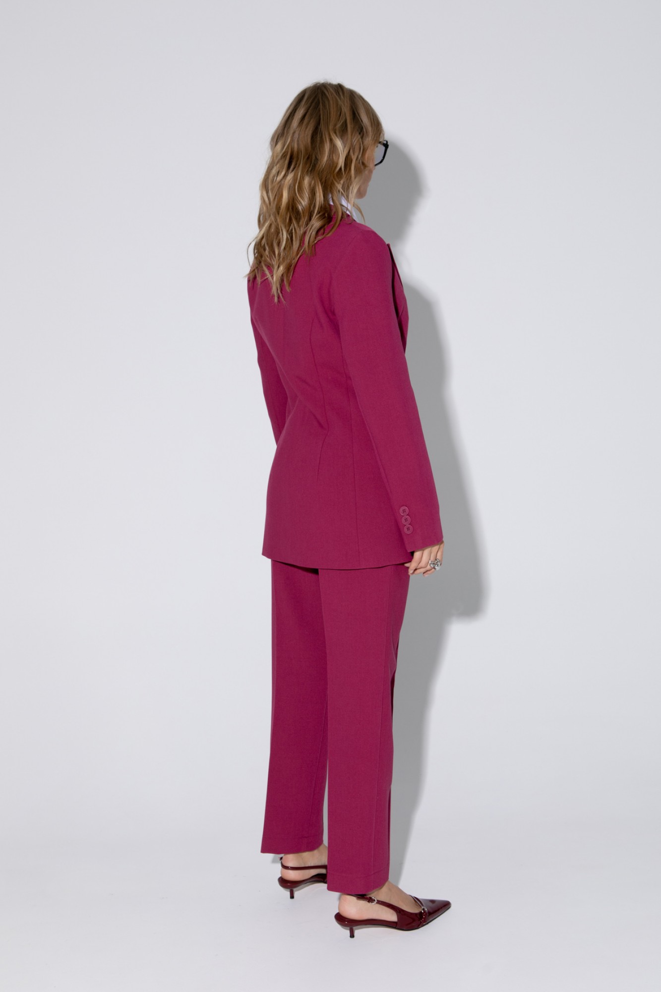 Детали: жакет прилегающего силуэта, талиевые вытачки, отрезные бочки, застежка на петли и пуговицы, пиджачный воротник, функциональные карманы, жакет на подкладке. Брюки с высокой посадкой на притачном поясе со шлевками, передние половины с небольшими застроченными мягкими складками и заутюженными стрелками, застежка на молнию и пуговицу, боковые карманы. Задние части брюк с вытачками и имитацией карманов.