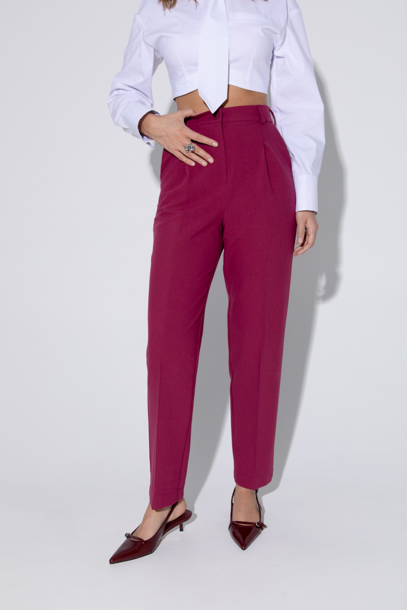 Текстильный костюм-двойка из приталенного жакета и укороченных брюк со стрелками.