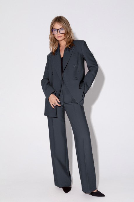 Детали: жакет свободного покроя и полуприлегающего силуэта, двубортная застежка на петли и пуговицы, отрезные бочки, пиджачный воротник, функциональные карманы, жакет на подкладке. Брюки с высокой посадкой, притачной пояс со шлевками, передние половины с небольшими застроченными мягкими складками и заутюженными стрелками, застежка на молнию и пуговицу, боковые карманы. Задние части брюк с вытачками и заутюженными стрелками. Пояс брюк прямой, без резинки.