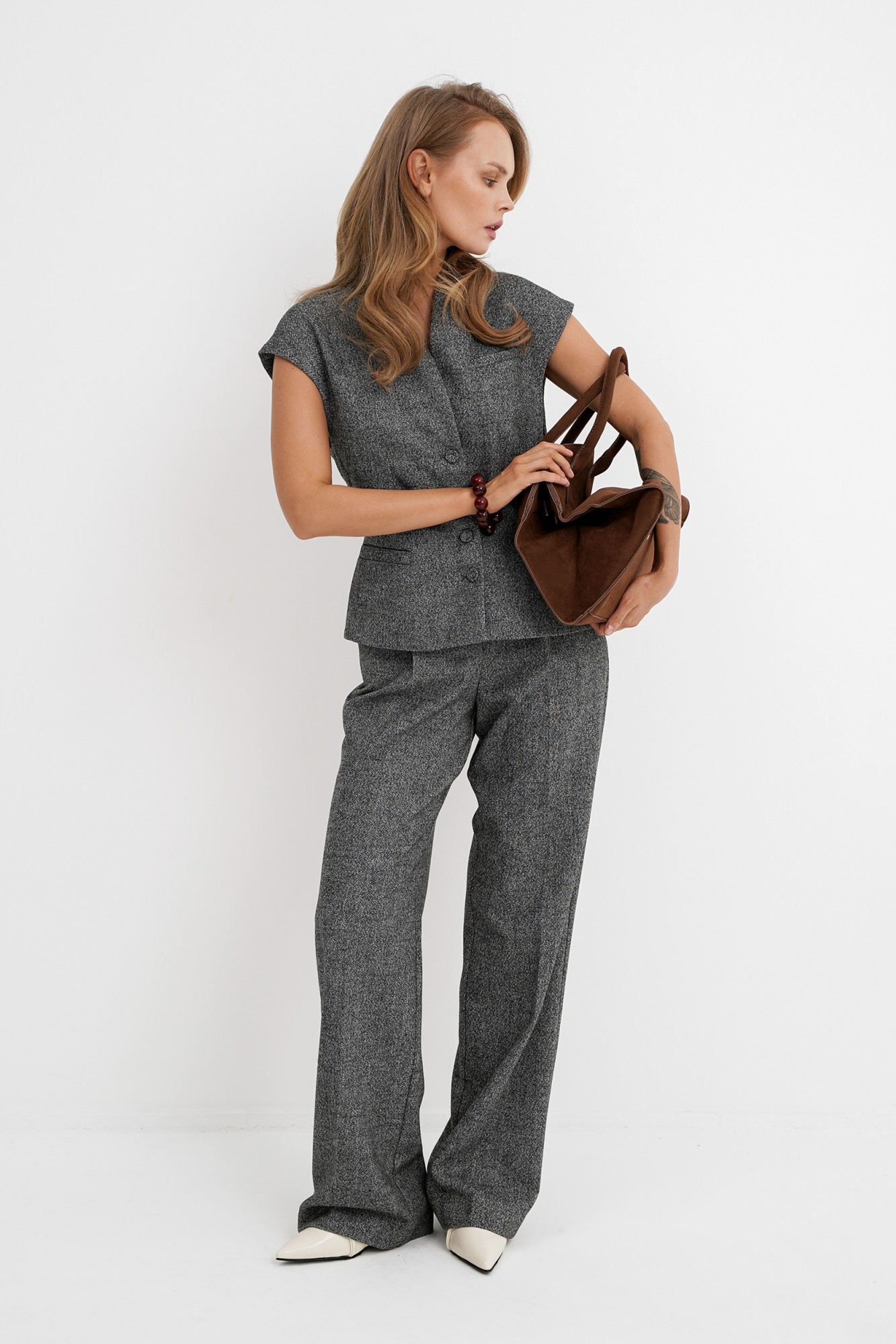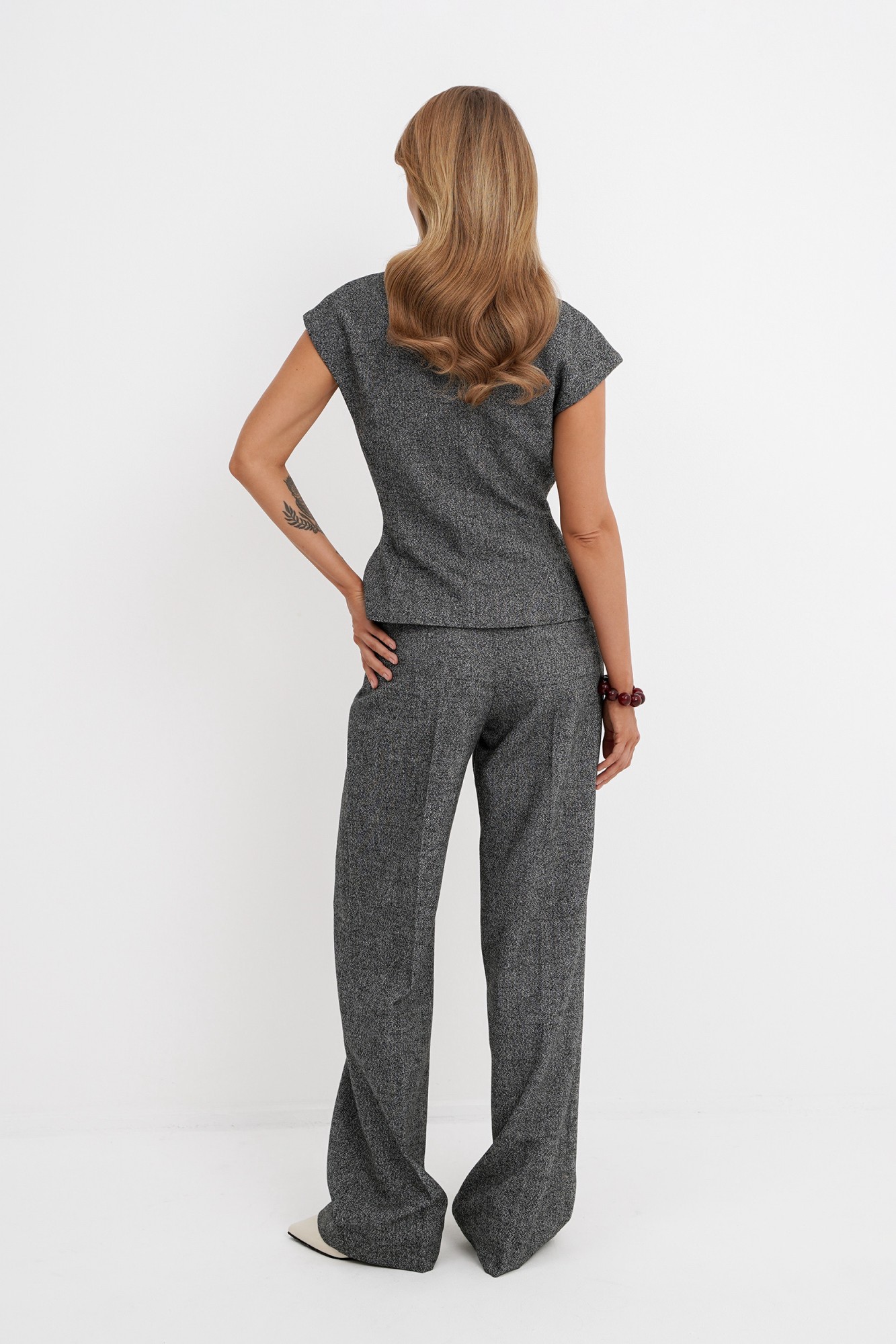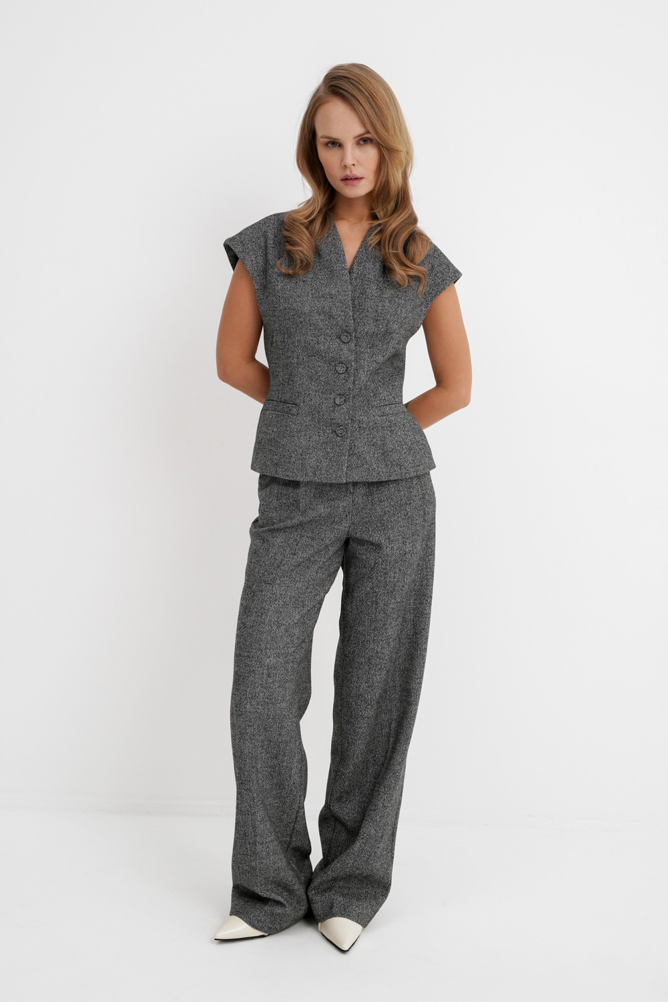 Костюм-двойка из приталенного жилета с воротником-стойкой и широких прямых брюк из меланжевой текстильной ткани. Детали: полуприлегающий силуэт, цельнокроеный воротник-стойка, рельефные швы переда и спинки, функциональные карманы, застежка на петли и пуговицы, жилет на подкладке. Брюки с притачным поясом со шлевками, передние половины с небольшими застроченными мягкими складками и заутюженными стрелками, застежка на молнию и пуговицу, боковые карманы. Задние части брюк с вытачками и заутюженными стрелками. Пояс брюк прямой, без резинки.