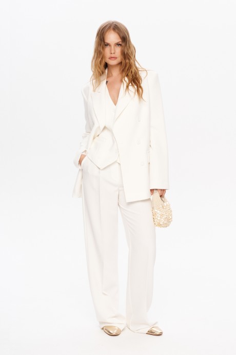 Текстильный костюм-двойка из свободного жакета и прямых широких брюк со стрелками. Детали: жакет свободного покроя и полуприлегающего силуэта, двубортная застежка на петли и пуговицы, отрезные бочки, пиджачный воротник, функциональные карманы, жакет на подкладке. Брюки с высокой посадкой, притачной пояс со шлевками, передние половины с небольшими застроченными мягкими складками и заутюженными стрелками, застежка на молнию и пуговицу, боковые карманы. Задние части брюк с вытачками и заутюженными стрелками. Пояс брюк прямой, без резинки.