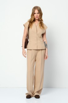 Костюм-двойка из приталенного жилета с воротником-стойкой и широких прямых брюк из текстильной ткани. Детали: полуприлегающий силуэт, цельнокроеный воротник-стойка, рельефные швы переда и спинки, функциональные карманы, застежка на петли и пуговицы, жилет на подкладке. Брюки с притачным поясом со шлевками, передние половины с небольшими застроченными мягкими складками и заутюженными стрелками, застежка на молнию и пуговицу, боковые карманы. Задние части брюк с вытачками и заутюженными стрелками. Пояс брюк прямой, без резинки.