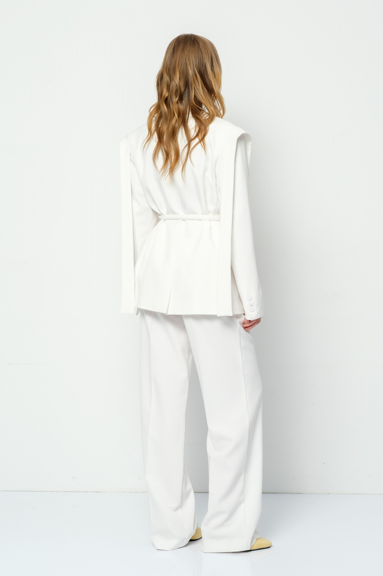 Текстильный костюм-двойка из свободного жакета с декором и прямых брюк со стрелками. Детали: жакет свободного покроя и полуприлегающего силуэта, двубортная застежка на петли и пуговицы, отрезные бочки, пиджачный воротник, функциональные карманы, съемный пояс. Жакет на подкладке. Брюки с высокой посадкой, притачной пояс со шлевками, передние половины с небольшими застроченными мягкими складками и заутюженными стрелками, застежка на молнию и пуговицу, боковые карманы. Задние части брюк с вытачками и заутюженными стрелками. Пояс брюк прямой, без резинки.