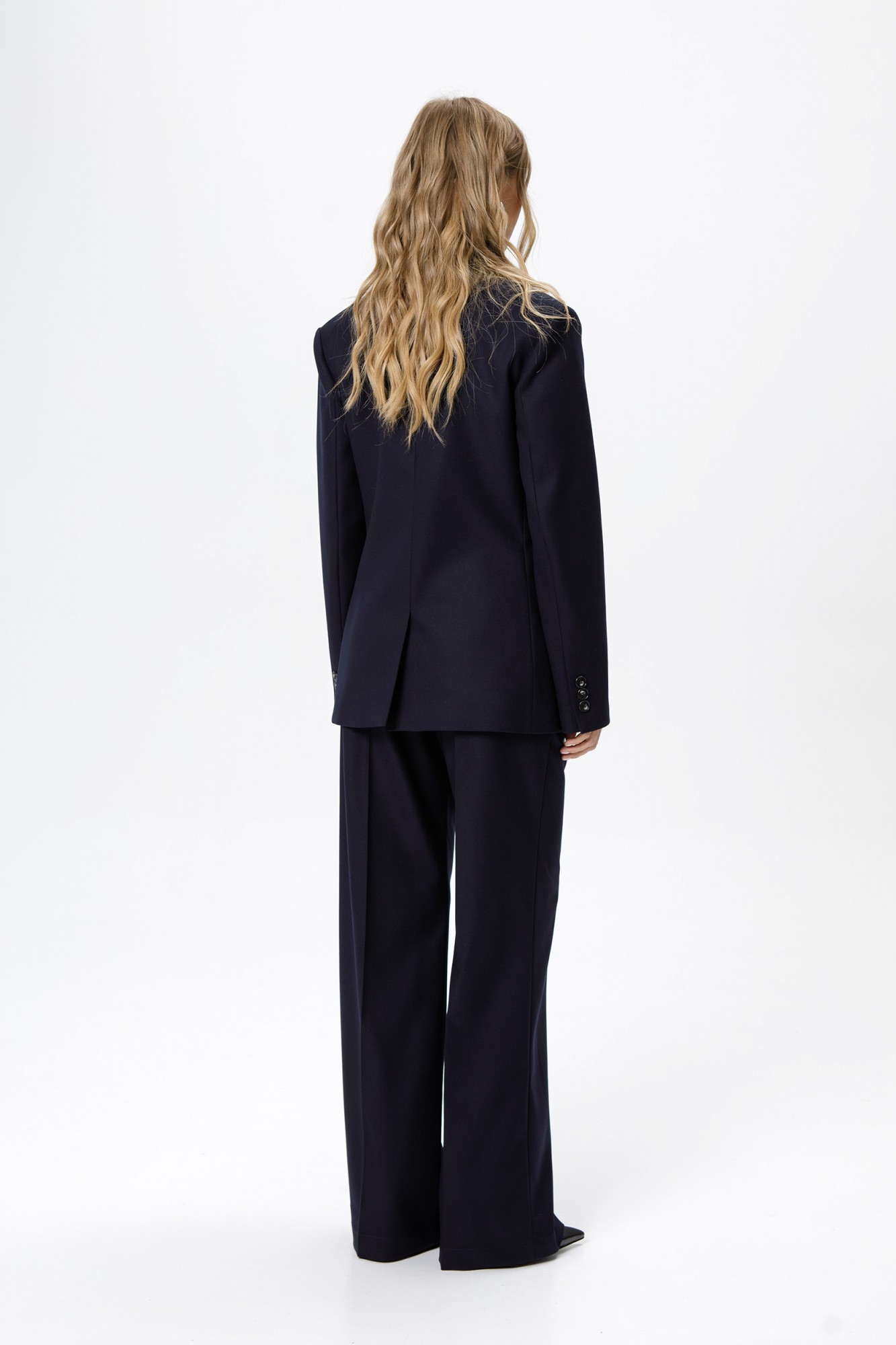 Текстильный костюм-тройка из свободного жакета, полуприлегающего жилета и прямых широких брюк со стрелками. Детали: жакет свободного покроя и полуприлегающего силуэта, двубортная застежка на петли и пуговицы, отрезные бочки, пиджачный воротник, функциональные карманы, жакет на подкладке. Жилет полуприлегающего силуэта, талиевые вытачки, застежка на петли и пуговицы, функциональные карманы, фигурный низ, на подкладке. Брюки с высокой посадкой, притачной пояс со шлевками, передние половины с небольшими застроченными мягкими складками и заутюженными стрелками, застежка на молнию и пуговицу, боковые карманы. Задние части брюк с вытачками и заутюженными стрелками. Пояс брюк прямой, без резинки.