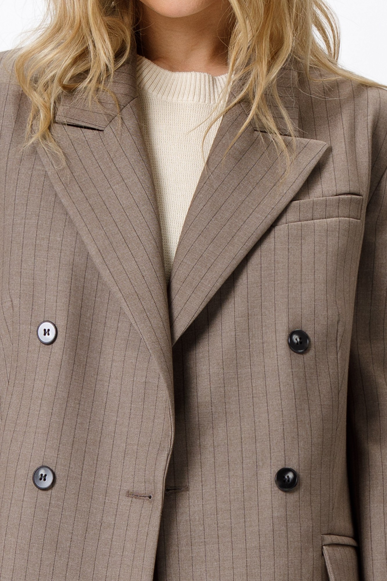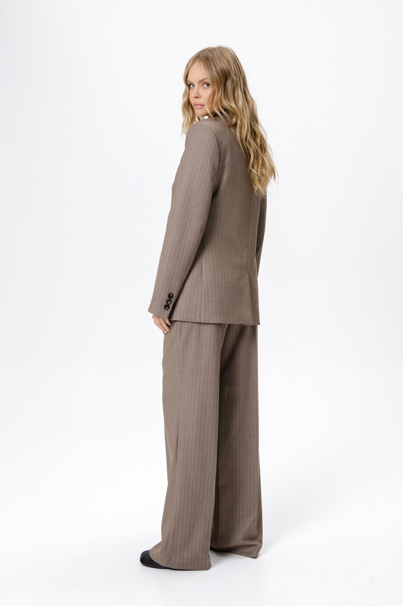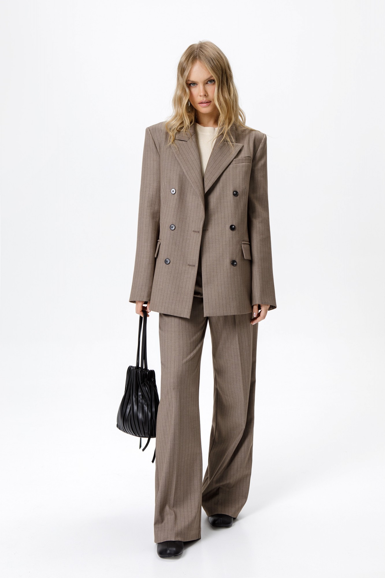 Текстильный костюм-тройка из свободного жакета, полуприлегающего жилета и прямых широких брюк со стрелками. Детали: жакет свободного покроя и полуприлегающего силуэта, двубортная застежка на петли и пуговицы, отрезные бочки, пиджачный воротник, функциональные карманы, жакет на подкладке. Жилет полуприлегающего силуэта, талиевые вытачки, застежка на петли и пуговицы, функциональные карманы, фигурный низ, на подкладке. Брюки с высокой посадкой, притачной пояс со шлевками, передние половины с небольшими застроченными мягкими складками и заутюженными стрелками, застежка на молнию и пуговицу, боковые карманы. Задние части брюк с вытачками и заутюженными стрелками. Пояс брюк прямой, без резинки.