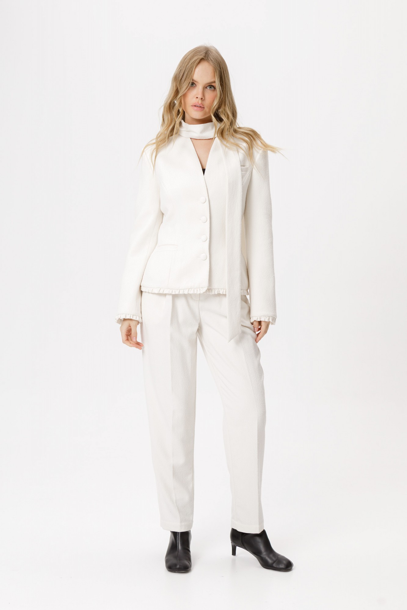 Костюм-двойка из приталенного жакета со съемным шарфиком и укороченных классических брюк со стрелками из фактурной ткани «букле». Детали: жакет полуприлегающего силуэта, цельнокроеный воротник-стойка, рельефные швы переда и спинки, функциональные карманы, застежка на петли и пуговицы, на подкладке. В комплекте съемный шарфик. Брюки с притачным поясом со шлевками, передние половины с застроченными мягкими складками и заутюженными стрелками, застежка на молнию и пуговицу, боковые карманы. Задние части брюк с вытачками и заутюженными стрелками. Пояс брюк без резинки.