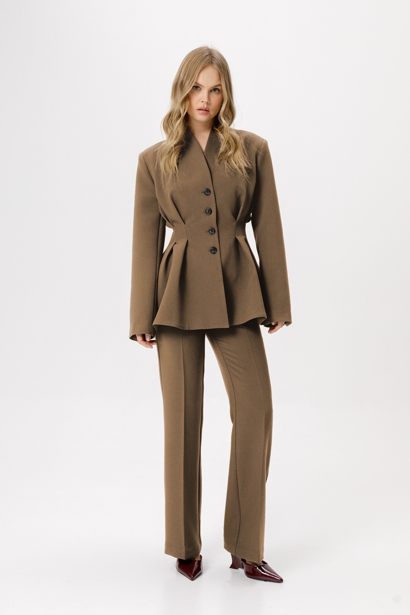 Костюм-двойка из приталенного жакета со складками и брюк-клеш со стрелками. Детали: жакет полуприлегающего силуэта с расширенными плечами, цельнокроеный воротник-стойка, застежка на петли и пуговицы, рукава втачные двухшовные, жакет на подкладке. Брюки с притачным поясом со шлевками, передние половины с заутюженными стрелками, застежка на молнию и потайные крючки, боковые карманы. Задние части брюк с вытачками и заутюженными стрелками. Пояс брюк без резинки.