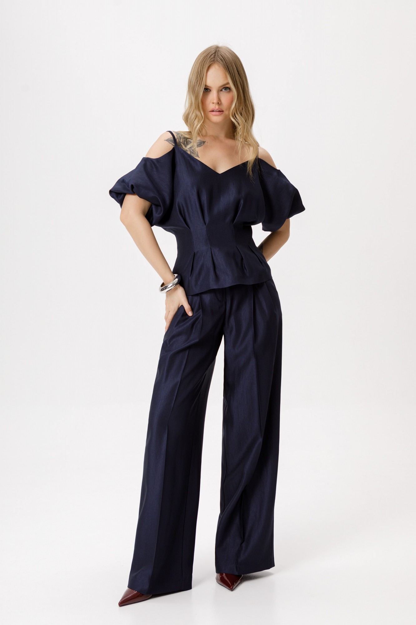 Костюм-двойка из приталенной блузы со складками и широких брюк-палаццо со стрелками. Детали: блуза приталенного силуэта с застроченными складками по линии талии, V-образный вырез переда и спинки, рукава короткие цельнокроеные с вырезом по плечу, застежка на потайную молнию по спинке, на подкладке. Брюки с притачным поясом со шлевками, складки у пояса, застежка на молнию и пуговицу, боковые карманы, заутюженные стрелки. Задние части брюк с вытачками и имитацией карманов.