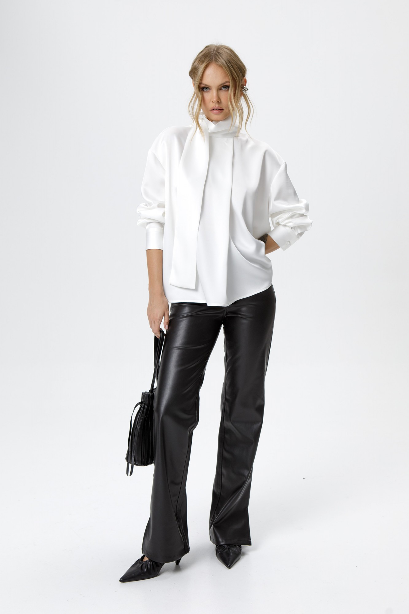 Комплект-двойка из свободной блузы со стойкой-бантом и прямых брюк из экокожи.