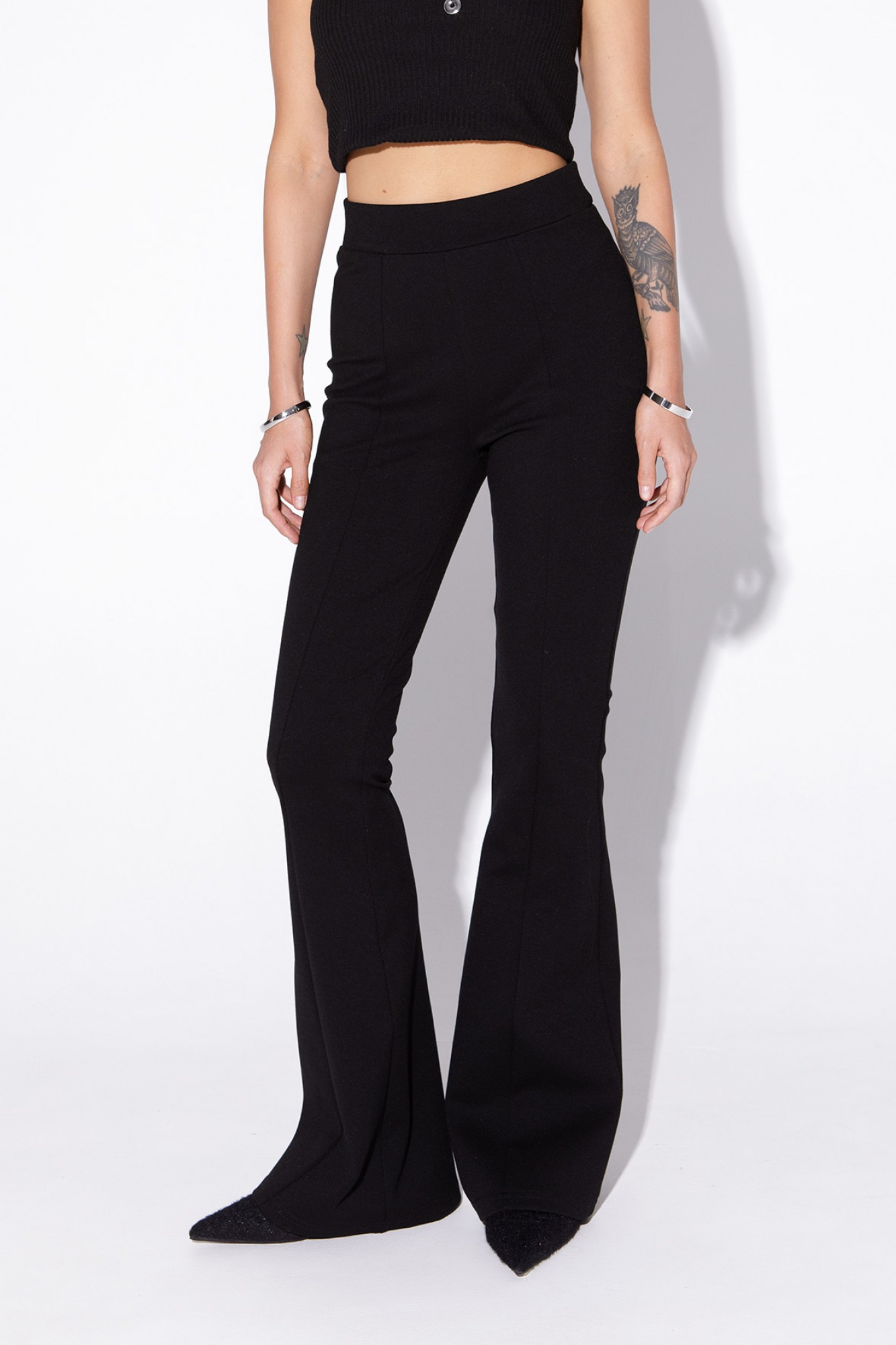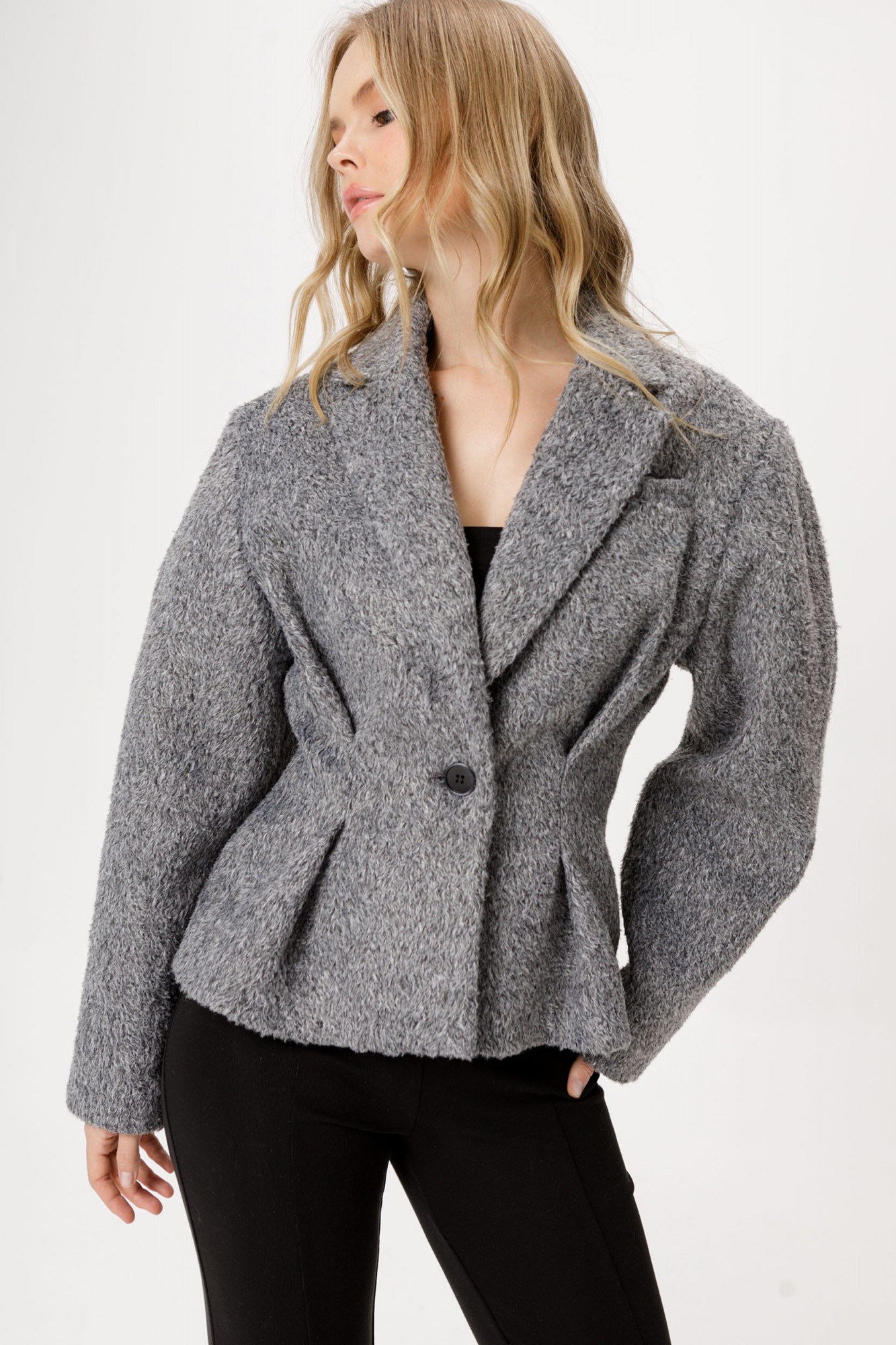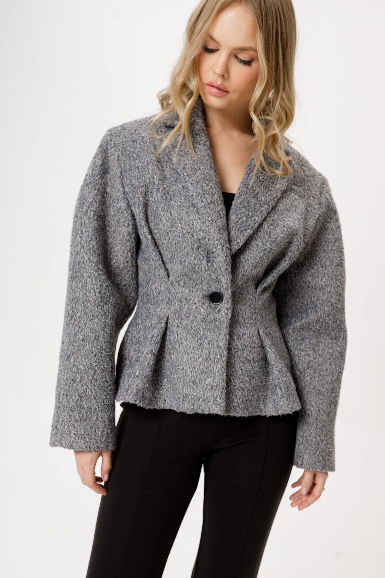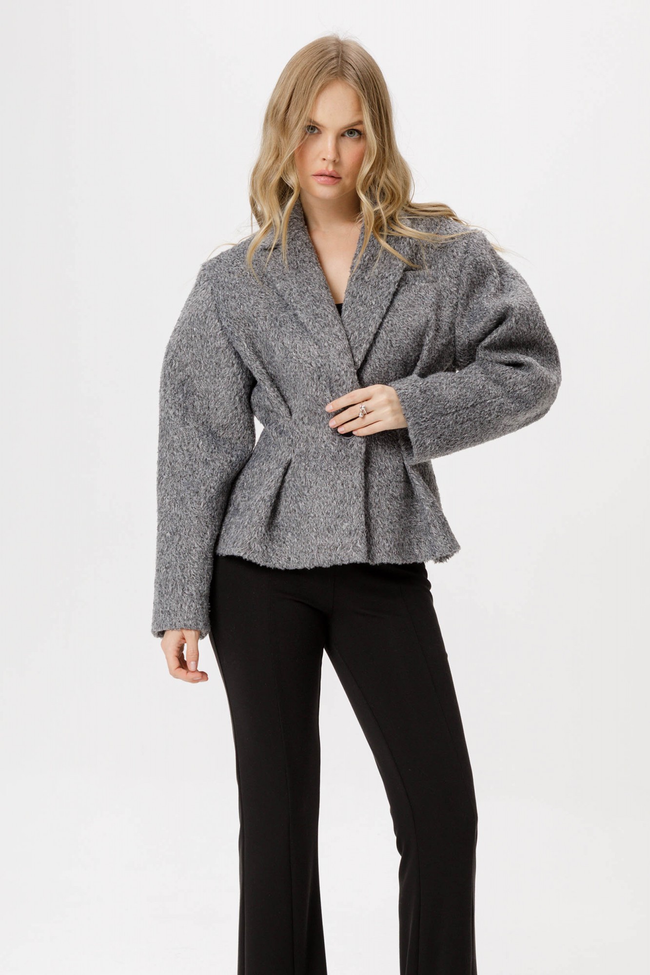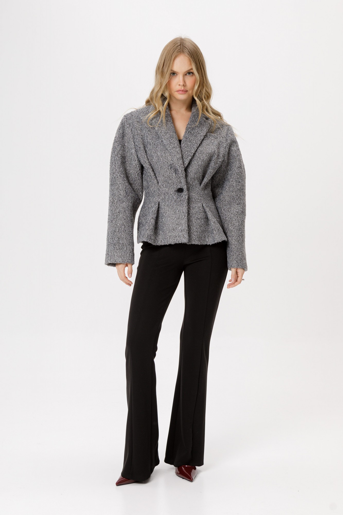 Комплект-двойка из приталенного жакета О-образного силуэта из утепленной фактурной ткани и трикотажных облегающих брюк-клеш.
