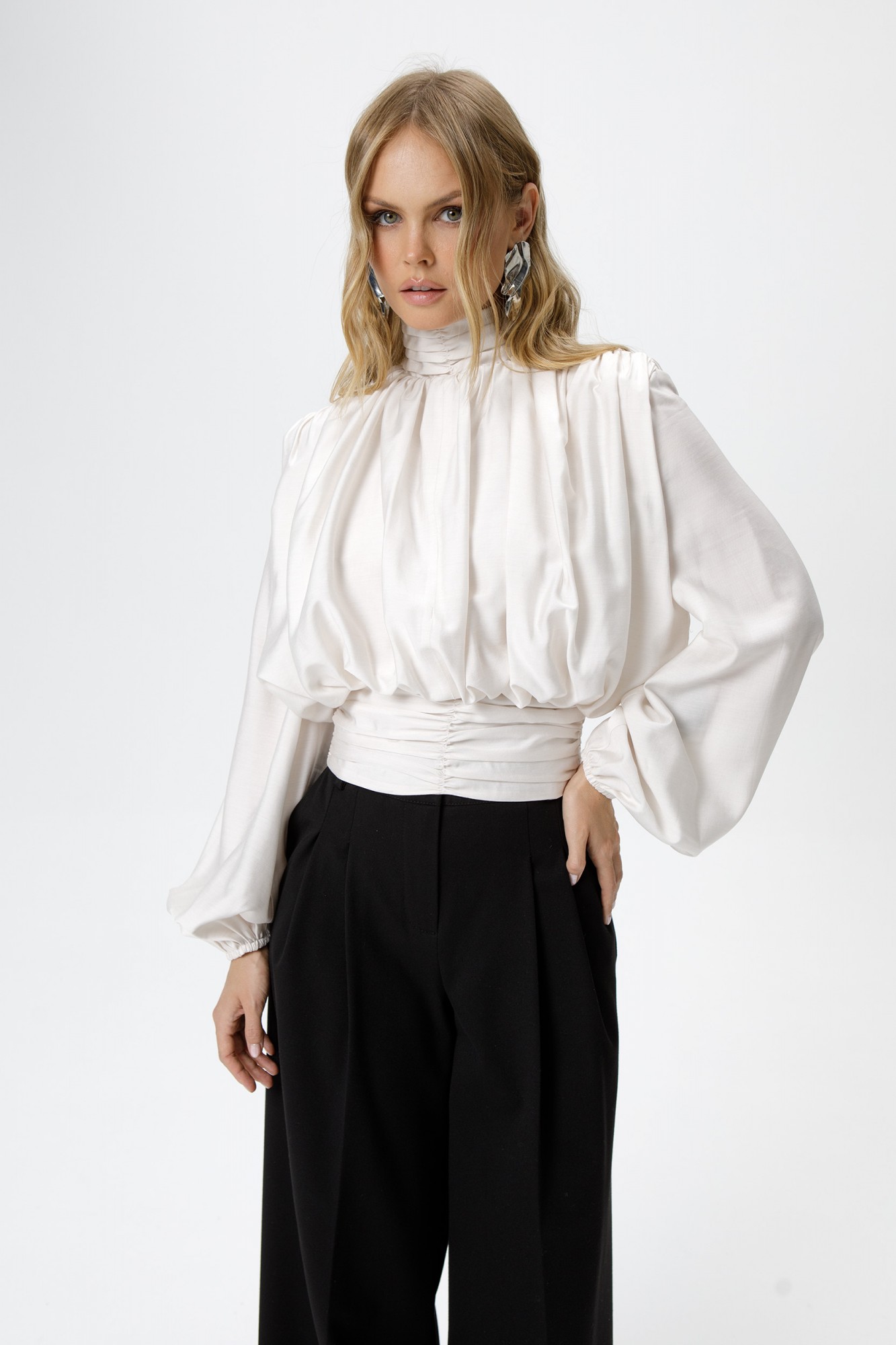 Детали: блуза приталенного силуэта, расширенные плечи, перед и спинка свободного покроя со сборками, пояс блузы со сборкой, застёжка на потайную молнию в боковом шве, воротник стойка со сборкой и застёжкой на навесные петли и пуговицы, втачные расширенные к низу рукава с резинкой по низу. Брюки с притачным поясом со шлевками, складки у пояса, застежка на молнию и пуговицу, боковые карманы, заутюженные стрелки. Задние части брюк с вытачками и имитацией карманов.