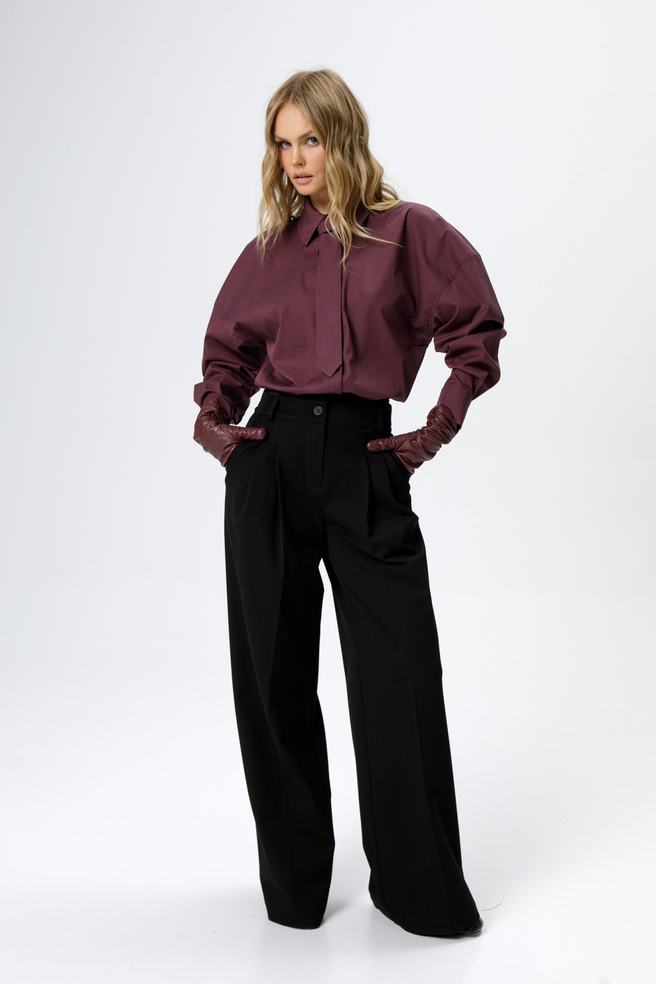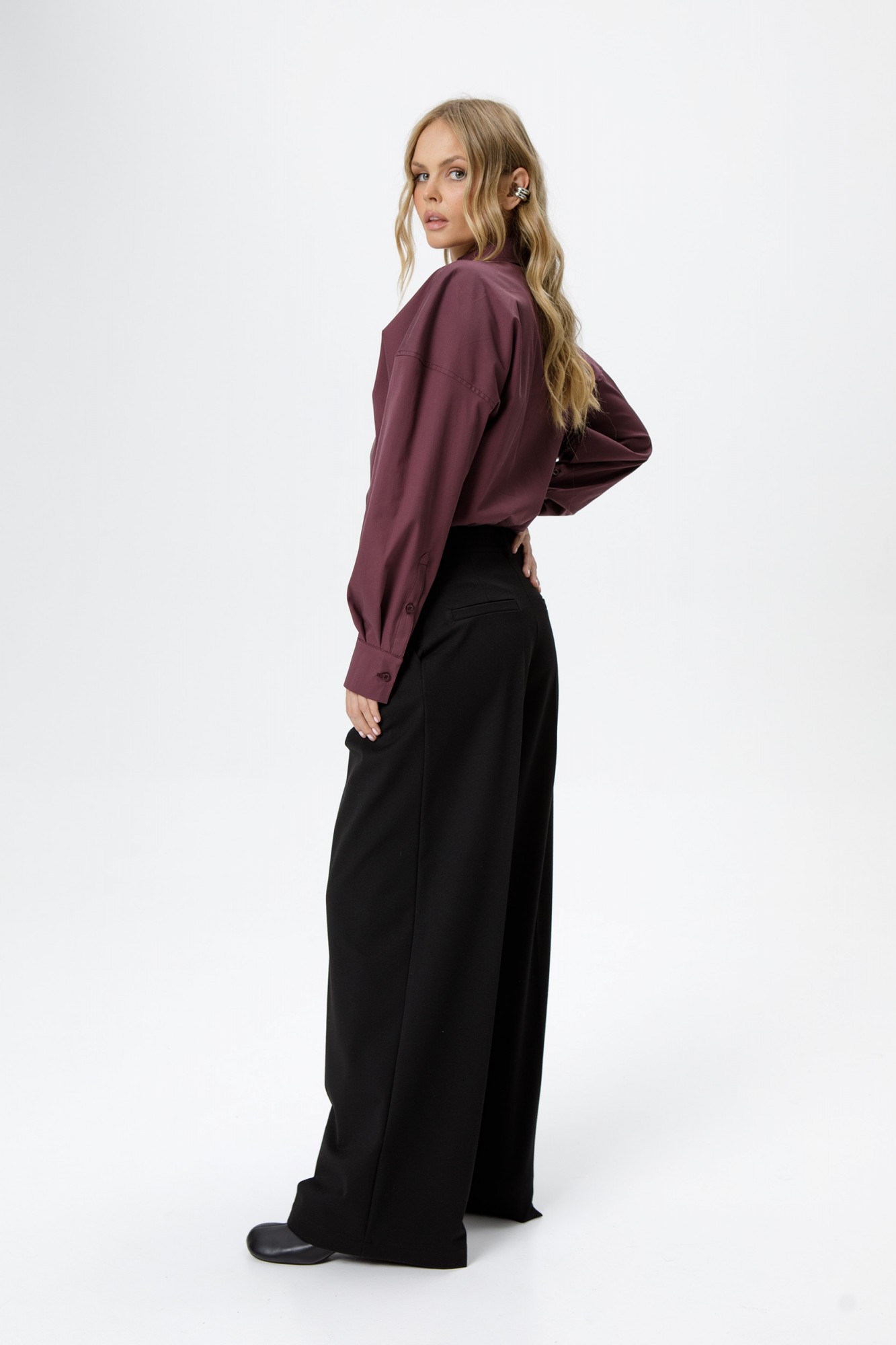 Детали: боди свободного кроя, рубашечный воротник, застежка на петли и пуговицы, съемный галстук в комплекте. Брюки с притачным поясом со шлевками, складки у пояса, застежка на молнию и пуговицу, боковые карманы, заутюженные стрелки. Задние части брюк с вытачками и имитацией карманов.