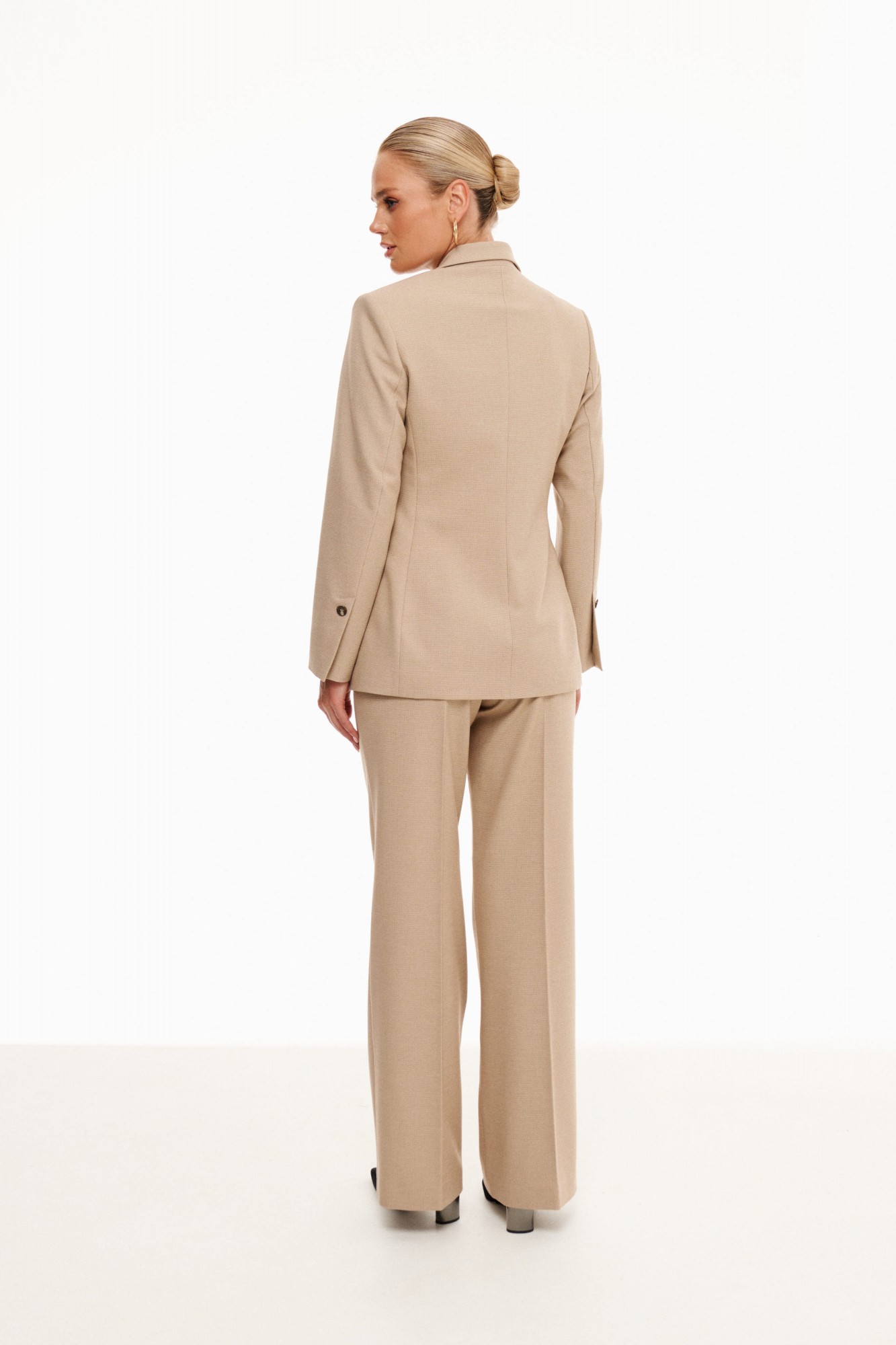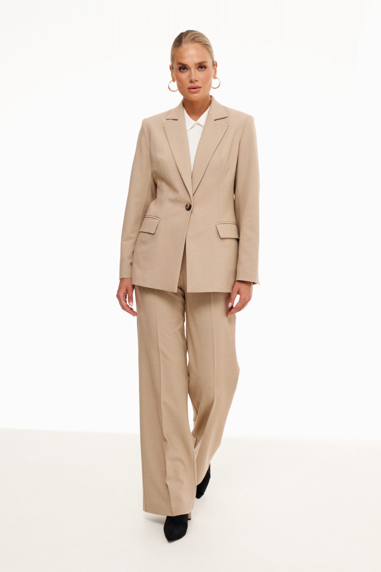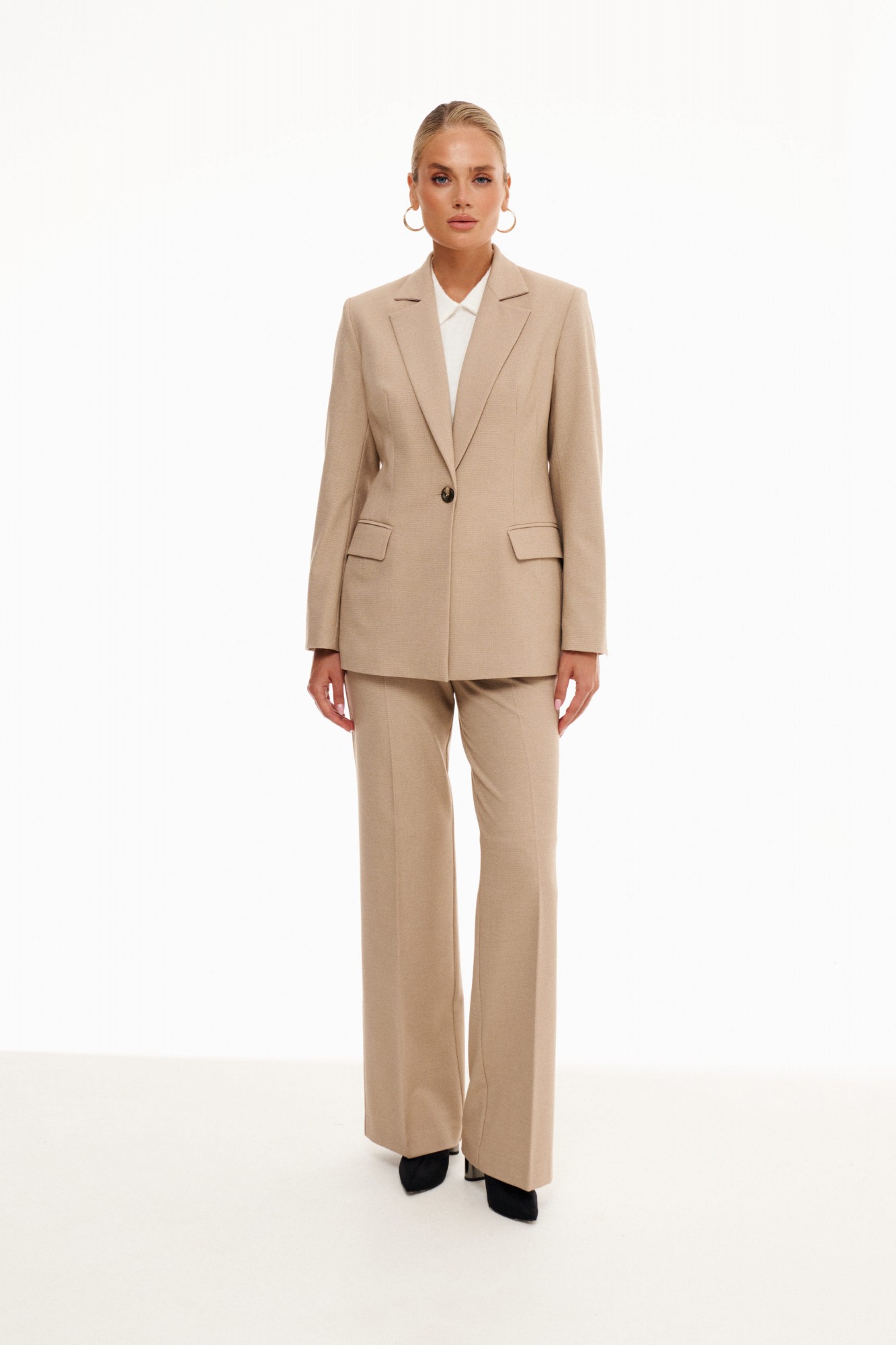 Жакет полуприлегающего силуэта, но подкладке, с рельефами по переду и спинке, однобортная застежка на петлю и пуговицу, воротник пиджачного типа, на деталях переда прорезные карманы с клапанами и двумя обтачками, рукава двухшовные, локтевые швы заканчиваются закрытой шпицей с декоративной пуговицей. Брюки прямые, с притачным поясом, застежкой на молнию и крючок, наклонными карманами в области боковых швов.