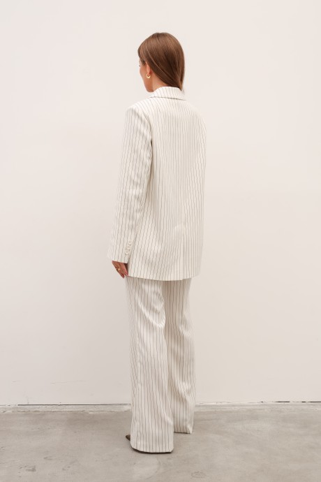 Костюм женский, двухпредметный (жакет и брюки) из костюмной ткани. Жакет двубортный, прямого свободного силуэта, длиной ниже линии бедер. Застежка на петли, пуговицы, карманы не функциональные. Воротник пиджачного типа. Жакет на подкладке, сзади присутствует шлица. Брюки прямые, длинные, спереди застежка на молнию и пуговицу. В боковых швах функциональные карманы. Съемная брошь в виде цветка.