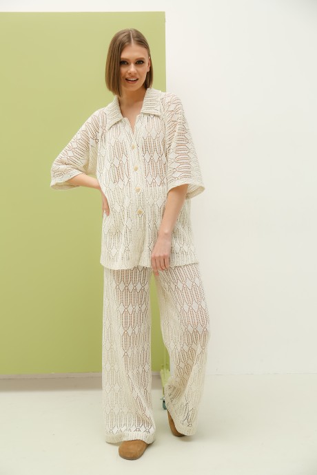 Костюм женский состоящий из блузы и брюк. Блуза свободного силуэта с центральной застежкой на петли пуговицы. Рукав цельнокроеный широкий, длиной от горловины 51 см. Воротник стояче-отложной. По боковым швам расположены 2 разреза. Брюки свободного силуэта, широкие без бокового шва. Верх брюк на подкладке с цельнокроеным поясом на резинке.