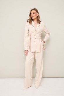 Комплект 2-предметный, состоящий из жакета и брюк, выполненный из костюмной ткани. Жакет полуприлегающего силуэта, с центральной застежкой на петли и пуговицы. Воротник пиджачного типа с отложными лацканами, край борта скругленный по низу жакета. В рельефных швах переда обработаны высокие разрезы с отделочными деталями. Рукава втачные, двухшовные. Спинка со средним швом. Жакет на подкладке. Брюки прямого силуэта с заутюженными стрелками и с боковыми наклонными карманами. Пояс притачной с застежкой на пуговицу и тесьму-молнию, по спинке пояс на резинке для регуляции размера. В комплекте прилагается ремень из основной ткани с обтяжной пряжкой.